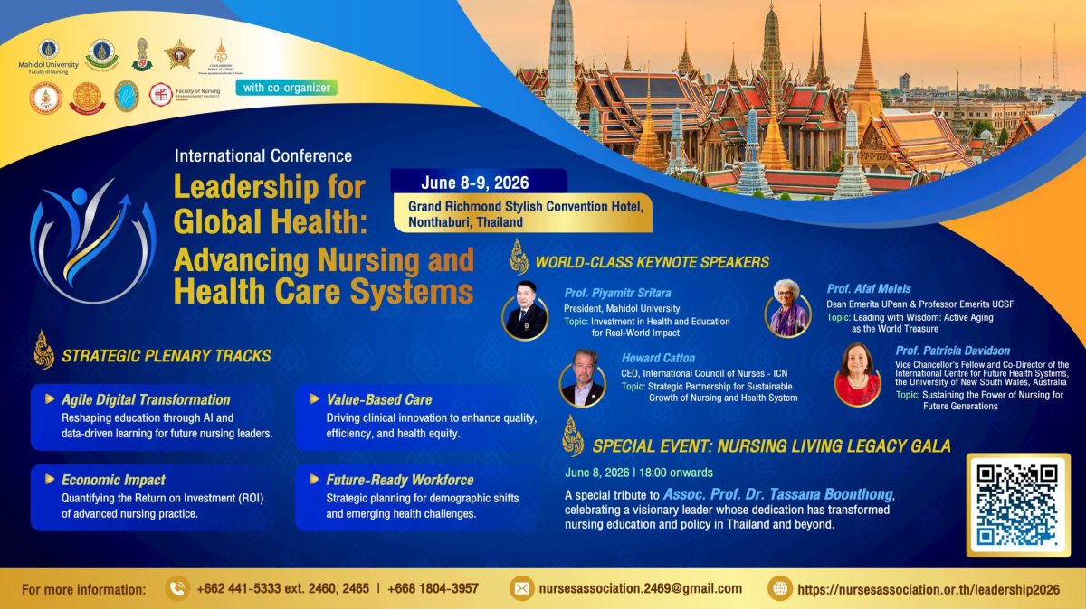 คณะพยาบาลศาสตร์ มหาวิทยาลัยมหิดล ร่วมกับเครือข่ายพันธมิตรระดับชาติและนานาชาติ ขอเชิญผู้บริหาร บุคลากรทางการพยาบาล นักวิชาการ นักวิจัย และผู้สนใจ เข้าร่วมการประชุมวิชาการนานาชาติ เรื่อง “Leadership for Global Health: Advancing Nursing and Health Care Systems” ซึ่งจะจัดขึ้นระหว่างวันที่ 8–9 มิถุนายน 2569 ณ โรงแรมแกรนด์ ริชมอนด์ จังหวัดนนทบุรี การประชุมครั้งนี้มุ่งเน้นบทบาทผู้นำทางการพยาบาลในการขับเคลื่อนระบบสุขภาพโลก ท่ามกลางความท้าทายจากการเปลี่ยนแปลงทางดิจิทัลและสังคมผู้สูงอายุ โดยเป็นเวทีแลกเปลี่ยนองค์ความรู้เชิงกลยุทธ์ เพื่อเชื่อมโยงนวัตกรรม เทคโนโลยี และภูมิปัญญาที่ยึดมนุษย์เป็นศูนย์กลาง สู่การสร้างระบบสุขภาพที่เข้มแข็ง ยั่งยืน และมีคุณค่าทางเศรษฐกิจและสังคม