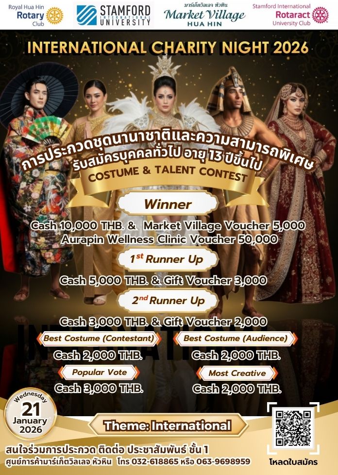 มหาวิทยาลัยนานาชาติแสตมฟอร์ด ร่วมกับ ศูนย์การค้ามาร์เก็ตวิลเลจ หัวหิน ขอเชิญทุกท่านร่วม สัมผัสความตระการตากับการประกวด Costume & Talent Contest ในธีม “International” ที่รวบรวมวัฒนธรรมจากทั่วโลกมาไว้บนเวทีเดียว พร้อมร่วมสนับสนุนโครงการบำเพ็ญประโยชน์เพื่อสังคมโดยสโมสรโรทาแรคท์ มหาวิทยาลัยแสตมฟอร์ด วันพุธที่ 21 มกราคม 2569 เริ่มงาน 17.30 น. เป็นต้นไป ณ ลานด้านหน้าศูนย์การค้ามาร์เก็ตวิลเลจ หัวหิน