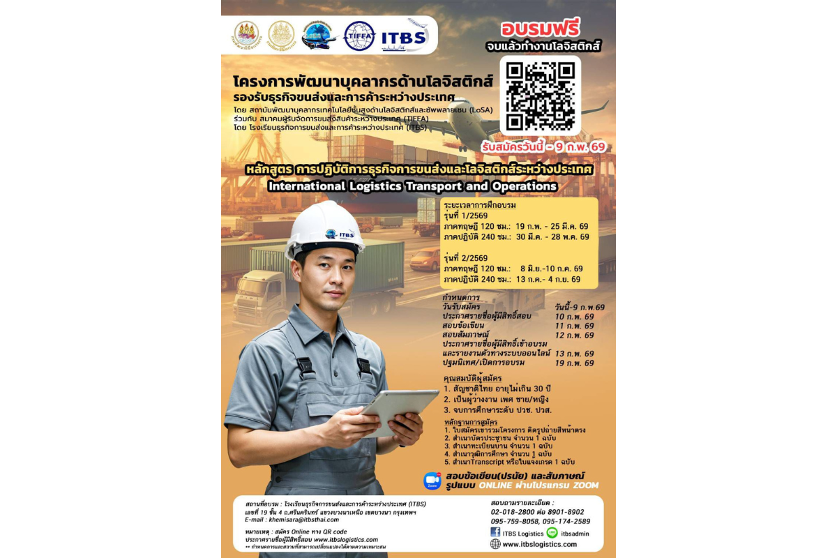 กรมพัฒนาฝีมือแรงงาน โดยสถาบันพัฒนาบุคลากรเทคโนโลยีชั้นสูงด้านโลจิสติกส์และซัพพลายเชน (LoSA) ร่วมกับ สมาคมผู้รับจัดการขนส่งสินค้าระหว่างประเทศ (TIFFA) โดย โรงเรียนธุรกิจการขนส่งและการค้าระหว่างประเทศ (ITBS) เปิดรับสมัครฝึกอบรม หลักสูตร การปฏิบัติการธุรกิจการขนส่งและโลจิสติกส์ระหว่างประเทศ สำหรับวุฒิ ปวช. และ ปวส. ตั้งแต่บัดนี้ ถึง 9 กุมภาพันธ์ 2569 เท่านั้