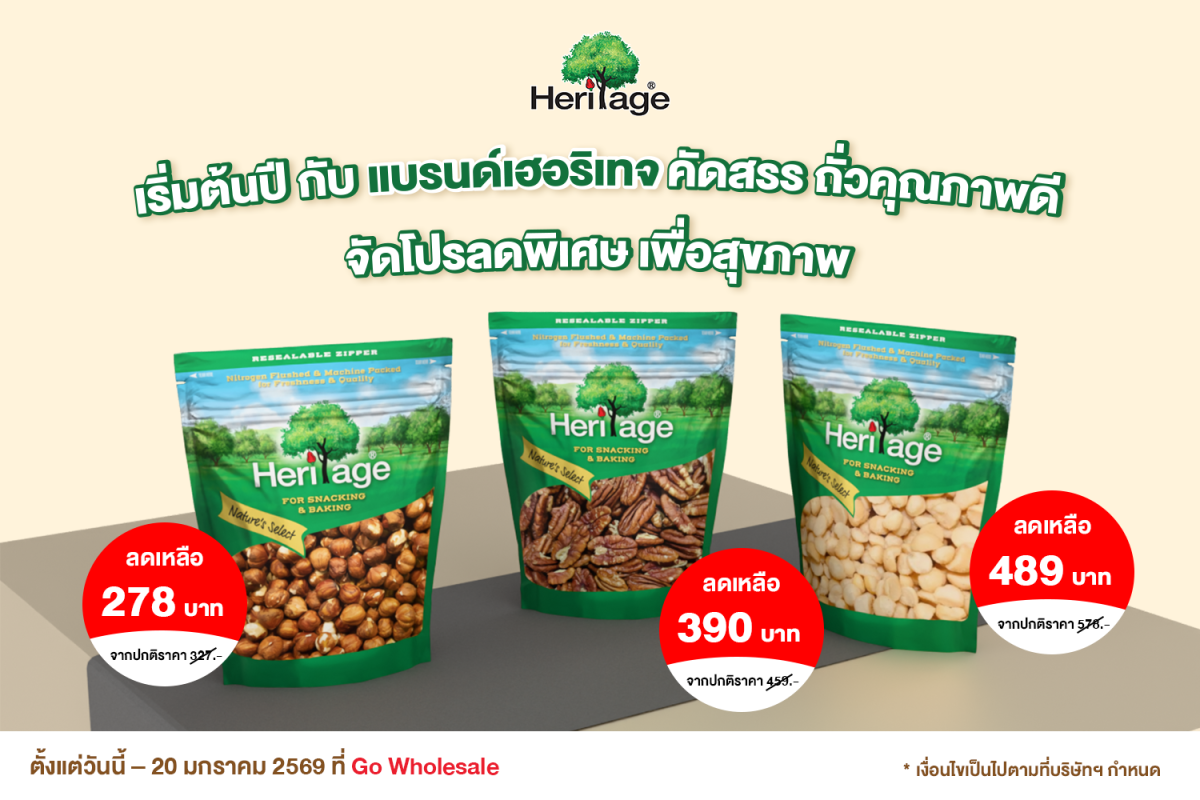 เริ่มต้นปี กับ แบรนด์เฮอริเทจ ผลิตภัณฑ์ถั่ว ธัญพืช และผลไม้อบแห้ง พรีเมียม สำหรับเป็นวัตถุดิบประกอบอาหาร คัดสรร ถั่วคุณภาพดี จัดโปรลดพิเศษ เพื่อสุขภาพ ได้แก่ พีแคนดิบ ขนาด 454 กรัม ราคาเต็ม 459 บาท ลดเหลือเพียง 390 บาท ฮาเซลนัทดิบ ขนาด 500 กรัม ราคาเต็ม 327 บาท ลดเหลือเพียง 278 บาท แมคคาดาเมียเม็ดดิบ 500 กรัม ราคาเต็ม 578 บาท ลดเหลือเพียง 489 บาท ตั้งแต่วันนี้ – 20 มกราคม 2569 ที่ Go Wholesale ทุกสาขา
