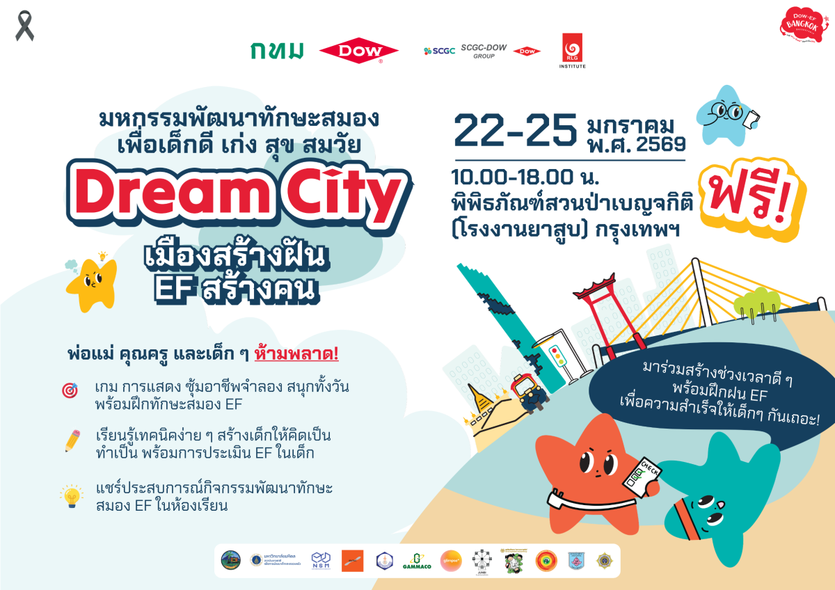 ข่าวดีสำหรับผู้ปกครอง คุณครู และน้องๆ ชาวกทม. กับควันหลงวันเด็กในปีนี้ ฟรี! ร่วมสนุกได้กว่า 40 ซุ้มกิจกรรมขนาดใหญ่ พร้อมเวทีการแสดงและแบ่งปันความรู้ด้านการพัฒนาทักษะสมอง EF หรือ Executive Function ในเด็ก ซึ่งเป็นสมองส่วนที่ควบคุมการคิดวิเคราะห์ การควบคุมอารมณ์ และการกำกับตนเอง พบกันวันที่ 22–25 มกราคม 2569 ณ พิพิธภัณฑ์สวนป่าเบญจกิติ (โรงงานยาสูบ) กรุงเทพมหานคร เวลา 10:00-18:00 น. กับมหกรรมพัฒนาทักษะสมองเพื่อเด็กดี เก่ง สุข สมวัย “ดรีมซิตี้: เมืองสร้างฝัน อีเอฟสร้างคน” ติดตามรายละเอียดได้ที่เฟซบุ๊ก Dow Thailand Group