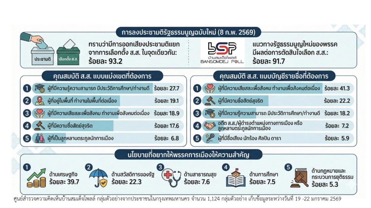ทราบว่า ในวันที่ 8 กุมภาพันธ์ 2569 มีการออกเสียงประชามติ ในประเด็นคำถาม ท่านเห็นชอบว่าสมควรมีรัฐธรรมนูญฉบับใหม่หรือไม่ โดยไปลงคะแนนเสียงแยกจากการเลือกตั้งสมาชิกสภาผู้แทนราษฏรที่อยู่ในจุดเลือกตั้งเดียวกัน ร้อยละ 93.2 และคิดว่าการมีแนวทางในการมีรัฐธรรมนูญฉบับใหม่ของพรรคการเมือง มีผลต่อการตัดสินใจในการเลือกสมาชิกสภาผู้แทนราษฏร ร้อยละ 91.7
