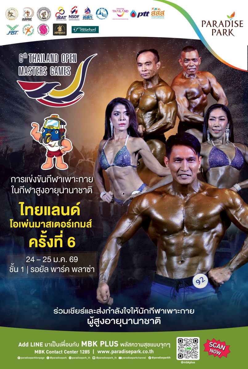 ตอกย้ำเป็นพื้นที่สนับสนุนกิจกรรมสร้างสรรค์เพื่อสังคมและคุณภาพชีวิตที่ดีอย่างยั่งยืน พาราไดซ์ พาร์ค ศูนย์การค้าในเครือเอ็ม บี เค ร่วมกับ การกีฬาแห่งประเทศไทย สมาคมกีฬาผู้สูงอายุไทย และ สมาคมกีฬาเพาะกายและฟิตเนสแห่งประเทศไทย ชวนชม การแข่งขันกีฬาเพาะกายในกีฬาสูงอายุนานาชาติ ไทยแลนด์ โอเพ่น มาสเตอร์ เกมส์ ครั้งที่ 6 ซึ่งการแข่งขันในครั้งนี้จัดขึ้นเพื่อเปิดเวทีให้นักกีฬาได้แสดงศักยภาพ ความแข็งแรง และวินัยในการดูแลสุขภาพ โดยแบ่งประเภทการแข่งขันออกเป็นหลากหลายรายการ ได้แก่ การแข่งขันเพาะกายชาย การแข่งขันเพาะกายหญิง การแข่งขันแอธเลติคฟิสิคชาย การแข่งขันโมเดลฟิสิคหญิง และการแข่งขันสปอร์ตฟิสิคชาย นอกจากนี้ ผู้ชนะการแข่งขันยังได้รับสิทธิ์เข้าร่วมการแข่งขันกีฬาเพาะกาย  ชิงชนะเลิศแห่งประเทศไทย (Mr. Thailand 2026) ซึ่งถือเป็นอีกหนึ่งเวทีสำคัญของวงการกีฬาเพาะกายระดับประเทศอีกด้วย