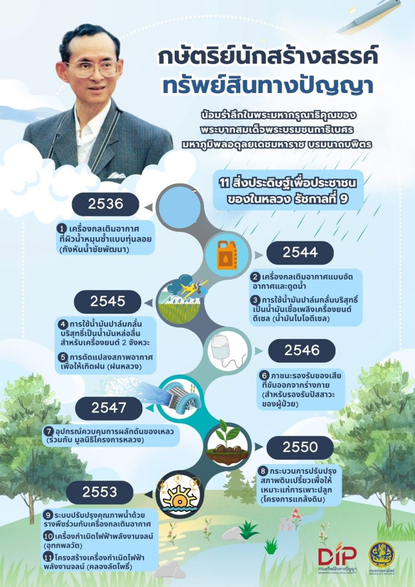 กรมทรัพย์สินทางปัญญา กระทรวงพาณิชย์ น้อมรำลึกในพระอัจฉริยภาพด้านการประดิษฐ์คิดค้นนวัตกรรมของพระบาทสมเด็จพระบรมชนกาธิเบศร มหาภูมิพลอดุลยเดชมหาราช บรมนาถบพิตร (ในหลวงรัชกาลที่ 9) ผู้ทรงเป็นพระบิดาแห่งการประดิษฐ์ไทย ด้วยพระปรีชาสามารถด้านวิทยาศาสตร์ เทคโนโลยี และวิศวกรรม พระองค์ทรงสร้างสรรค์ผลงาน “สิทธิบัตร” อันทรงคุณค่า ทั้ง 11 ฉบับ ที่ช่วยแก้ไขปัญหาพื้นฐานของประเทศและยกระดับคุณภาพชีวิตของประชาชนอย่างยั่งยืน