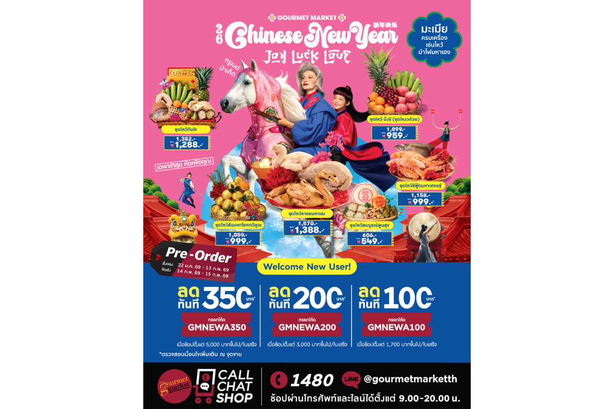กูร์เมต์ มาร์เก็ต พรีเมียมซูเปอร์มาร์เก็ตระดับเวิลด์คลาส ภายใต้การบริหารโดยเดอะมอลล์ กรุ๊ป ต้อนรับเทศกาลตรุษจีน 2569 จัดแคมเปญ “Gourmet Market JOY LUCK LOVE CHINESE NEW YEAR 2026” ภายใต้คอนเซ็ปต์ “มะเมีย ครบเครื่อง เซ่นไหว้ ม้าไฟมหาเฮง” คัดสรรชุดไหว้มงคลคุณภาพดี ครบครัน ถูกต้องตามหลักการไหว้ พร้อมเปิดพรีออเดอร์ชุดไหว้หลากหลายรูปแบบอำนวยความสะดวกคนยุคใหม่ ประกอบด้วย ชุดไหว้ซาแซมหาเฮง, ชุดไหว้ซีฟู้ดมหาเศรษฐี, ชุดไหว้ทันใจ, ชุดไหว้มั่งมี (โหงวก้วย), ชุดไหว้สมบูรณ์พูนสุข (โหงวเปี๊ยะ) และชุดไหว้ส้มมหาโชคทวีคูณ (ส้มห่อทอง) พิเศษสำหรับลูกค้าใหม่ รับส่วนลดทันทีสูงสุด 350 บาท เมื่อช้อปครบ 5,000 บาทขึ้นไป/ใบเสร็จ