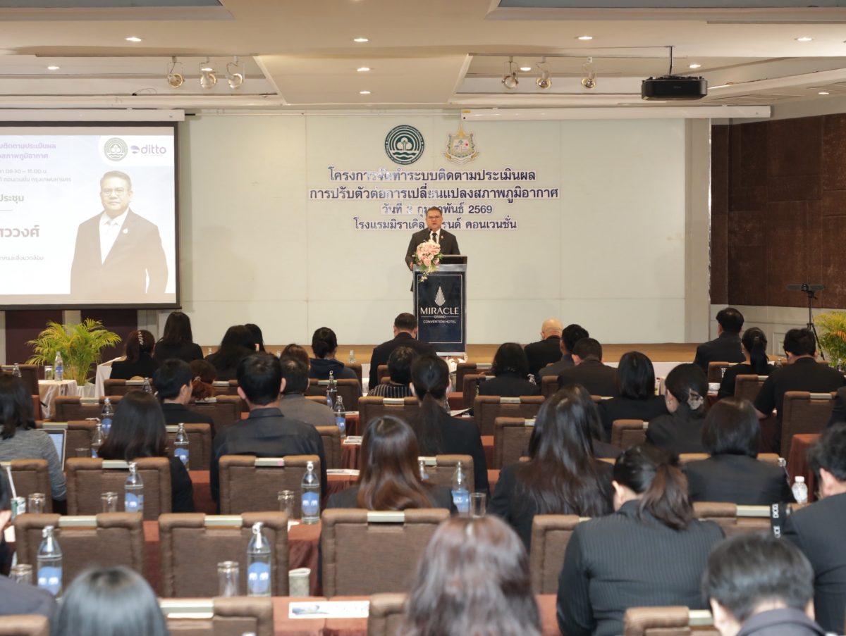 วันที่ 3 กุมภาพันธ์ 2569 กระทรวงทรัพยากรธรรมชาติและสิ่งแวดล้อม (ทส.) โดยกรมการเปลี่ยนแปลงสภาพภูมิอากาศและสิ่งแวดล้อม (สส.) จัดประชุมนำเสนอ “โครงการจัดทำระบบติดตามประเมินผลการปรับตัวต่อการเปลี่ยนแปลงสภาพภูมิอากาศ” เพื่อยกระดับกลไกการติดตามประเมินผลการดำเนินงานด้านการปรับตัวของประเทศไทยให้มีประสิทธิภาพ สอดคล้องกับเป้าหมายการปรับตัวระดับโลก และรองรับการรายงานในระดับนานาชาติ โดยมีนายปวิช เกศววงศ์ รองอธิบดีกรมการเปลี่ยนแปลงสภาพภูมิอากาศและสิ่งแวดล้อม เป็นประธาน ในพิธีเปิด พร้อมด้วย นางสาวระเบียบ ภูผา ผู้อำนวยการกองขับเคลื่อนการปรับตัวต่อการเปลี่ยนแปลงสภาพภูมิอากาศ กล่าวรายงาน โดยมีผู้เข้าร่วมจากหน่วยงานรายสาขาและผู้ที่เกี่ยวข้อง ทั้งในห้องประชุม และผ่านระบบออนไลน์ รวมกว่า 250 คน ณ โรงแรมมิราเคิล แกรนด์ คอนเวนชั่น กรุงเทพมหานคร
