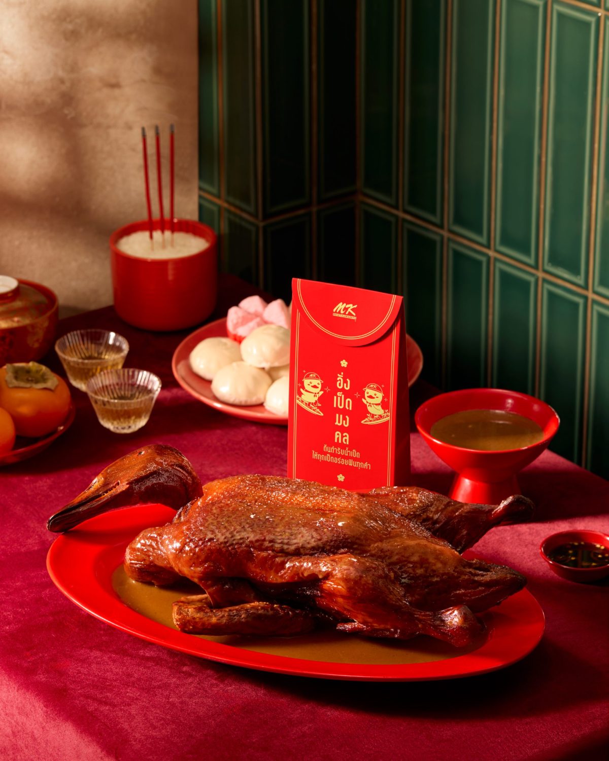 - เซตไหว้มหามงคลสั่งไปทานที่บ้าน เริ่มต้นเพียง 750 บาท มีให้เลือกมากถึง 5 ชุดแบบจัดเต็ม เพื่อตอบโจทย์สายสะดวกที่เน้นคุณภาพและถูกต้องตามหลักการไหว้ ประกอบไปด้วย เป็ดย่าง MK, ไก่ต้มมงคล, เครื่องในเป็ด/ไก่, หมูแดงสูตรฮ่องกง, หมูกรอบหนาพิเศษ, ซาลาเปาส้มมงคล, บะหมี่หยกกลาง, ข้าวอบจักรพรรดิ, เมนูติ่มซำ และของทอด พร้อมรับ ‘อั่งเป็ดมหามงคล’, ซองอั่งเปา พร้อมคูปองส่วนลด 100 บาท’ และ ‘ฮู้เทพเจ้าไฉ่ซิงเอี๊ย’ เพื่อเสริมโชคลาภ สั่งจองได้ตั้งแต่วันที่ 27 มกราคม – 15 กุมภาพันธ์ 2569