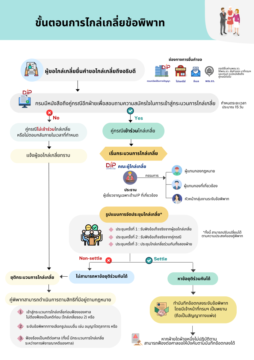 กรมทรัพย์สินทางปัญญาเชื่อมั่นว่า กระบวนการไกล่เกลี่ยข้อพิพาทของกรมฯ สามารถตอบโจทย์การจัดการความขัดแย้งด้านทรัพย์สินทางปัญญาในปัจจุบัน และช่วยเหลือผู้ประกอบการ เจ้าของสิทธิ และประชาชนทั่วไป ให้มีทางเลือกในการแก้ไขปัญหาได้อย่างตรงจุด ช่วยสร้างบรรยากาศทางธุรกิจด้านทรัพย์สินทางปัญญาที่เป็นธรรม โปร่งใส และยั่งยืน ทั้งนี้ กรมฯ ได้จัดทำอินโฟกราฟิกเพื่ออธิบายขั้นตอนและข้อมูลที่เกี่ยวข้อง ผ่านทางเว็บไซต์ www.ipthailand.go.th/th/การระงับข้อพิพาท.html และประชาชนที่ประสงค์ใช้บริการไกล่เกลี่ยข้อพิพาทด้านทรัพย์สินทางปัญญา สามารถขอรับคำปรึกษาและสอบถามข้อมูลเพิ่มเติมได้ที่กลุ่มระงับข้อพิพาท กองกฎหมาย กรมทรัพย์สินทางปัญญา โทร. 02-547-5029 หรือ อีเมล [email protected]