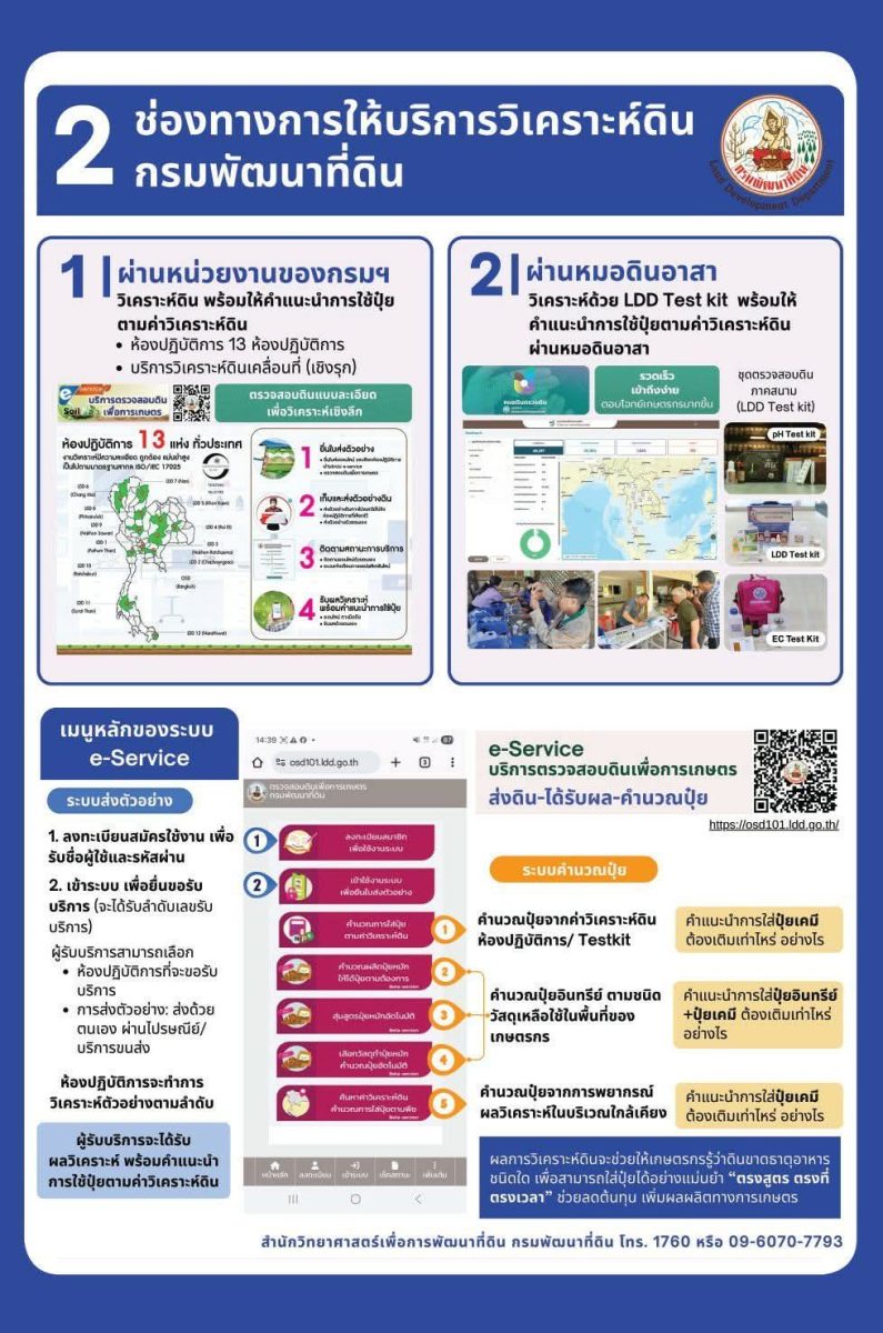 สอบถามบริการวิเคราะห์ดินและ Test Kit ได้ที่ สำนักวิทยาศาสตร์เพื่อการพัฒนาที่ดิน กรมพัฒนาที่ดิน โทร. 1760