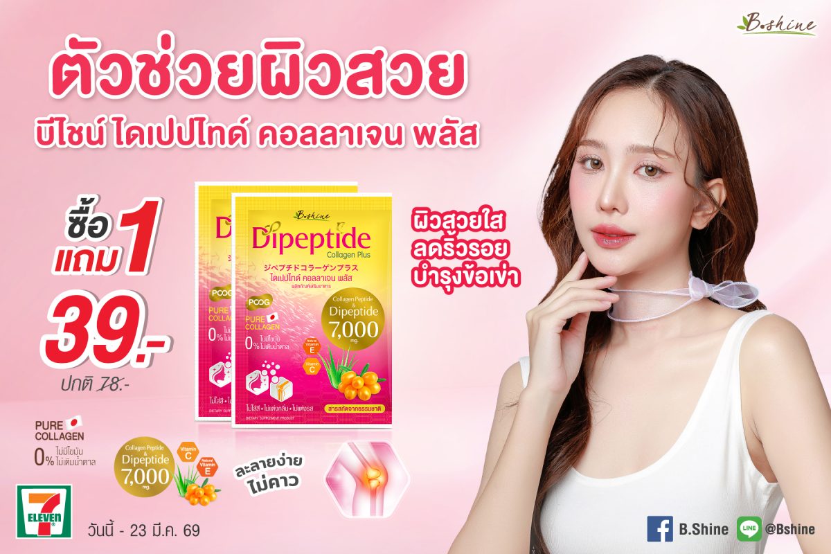 โปรโมชั่นสุดคุ้มที่คุณห้ามพลาด! บีไชน์จัดหนักให้คุณดูแลตัวเองได้ง่ายขึ้นกับโปรโมชั่น “บีไชน์ ไดเปปไทด์ คอลลาเจน พลัส” ขนาดซองบรรจุ 7,200 มิลลิกรัม ซื้อ 1 แถม 1 ในราคาพิเศษเพียง 39 บาท (จากราคาปกติ 78 บาท) และสิทธิพิเศษเฉพาะสมาชิก All Member ลดเพิ่มอีก 1 บาท เหลือเพียง 38 บาท หาซื้อได้ตั้งแต่วันนี้ – 23 มีนาคม 2569 ที่ร้านเซเว่น อีเลฟเว่น ใกล้บ้านคุณ
