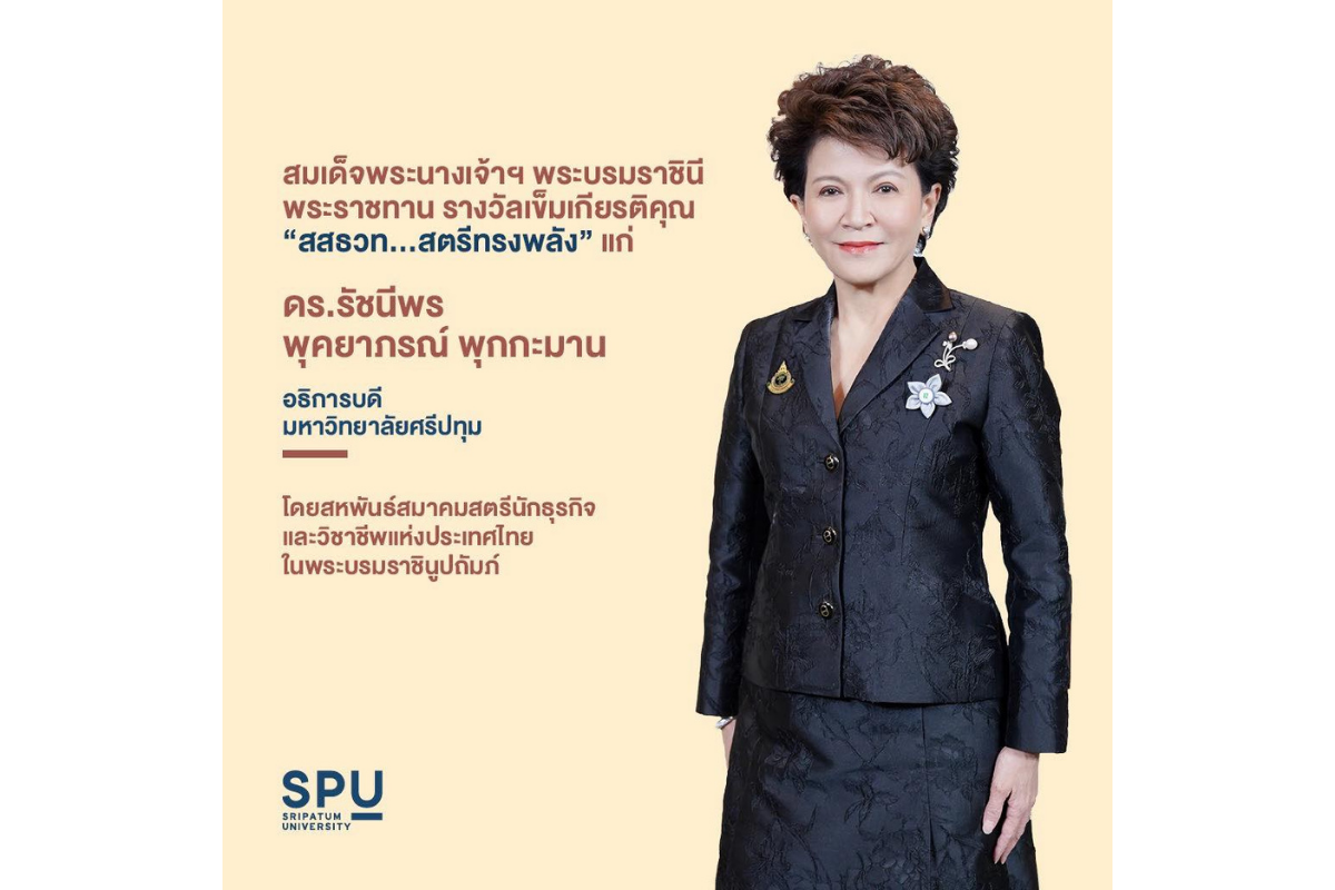 ดร.รัชนีพร พุคยาภรณ์ พุกกะมาน อธิการบดีมหาวิทยาลัยศรีปทุม (SPU) เข้ารับพระราชทานรางวัลเข็มเกียรติคุณ “สสธวท…สตรีทรงพลัง” จากสมเด็จพระนางเจ้าสุทิดา พัชรสุธาพิมลลักษณ พระบรมราชินี ในวาระครบรอบ ๕๐ ปี สหพันธ์สมาคมสตรีนักธุรกิจและวิชาชีพแห่งประเทศไทย ในพระบรมราชินูปถัมภ์ และ ๑๐ ปี ASEAN Women Entrepreneurs Network Thailand ณ โรงแรมแกรนด์ ไฮแอท เอราวัณ กรุงเทพ เมื่อวันที่ ๔ มีนาคม ๒๕๖๙
