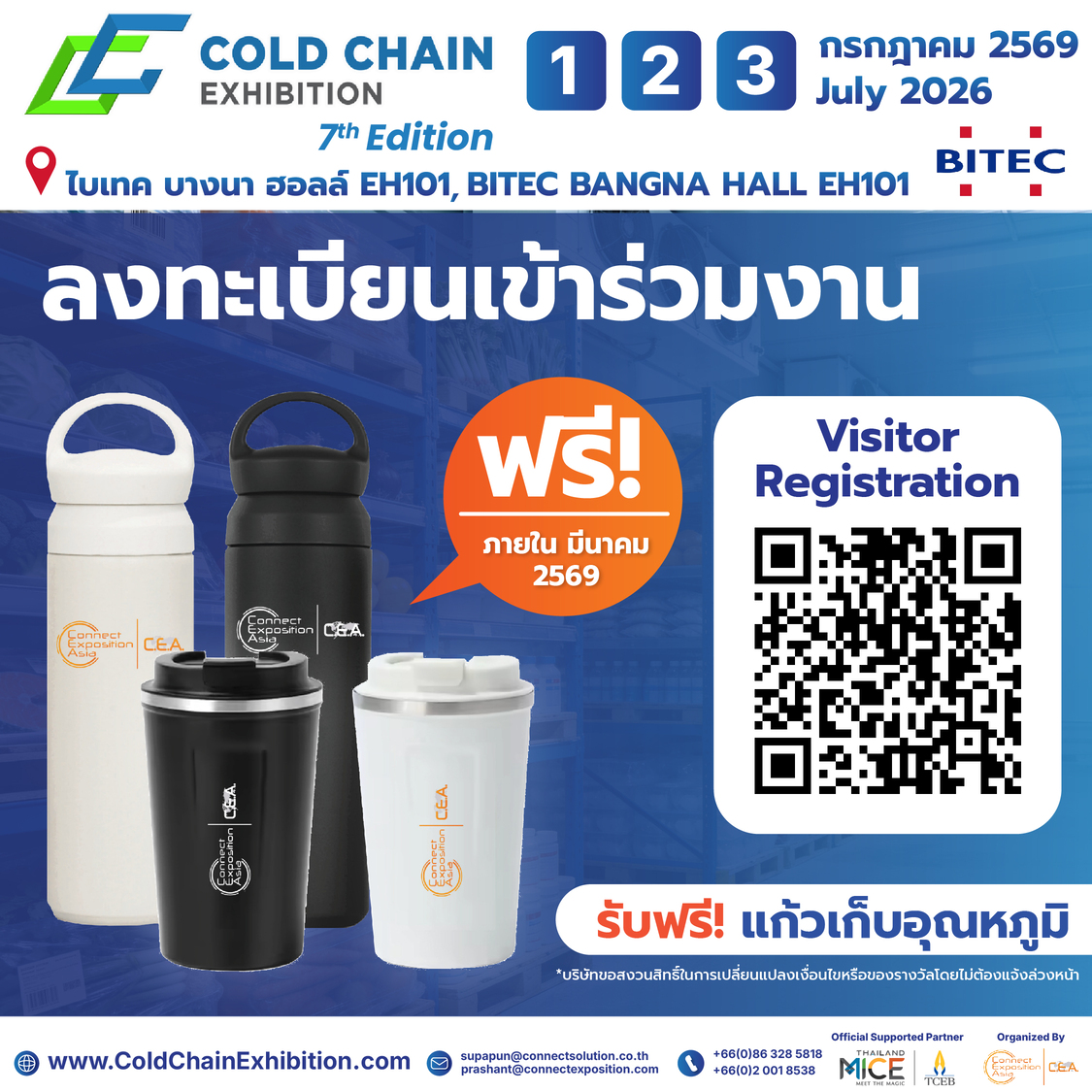 Cold Chain Exhibition 2026 (CCE) “จุดนัดพบแห่งอนาคต Cold Chain”1-2-3 กรกฎาคม 2569ไบเทค บางนา Hall 101ลงทะเบียนจองบูธเเสดงสินค้า https://coldchainexhibition.com/TExhibitor-Registration ฟรี! ลงทะเบียนเข้าชมงาน https://coldchainexhibition.com/visitor-registrationLine OA : https://lin.ee/AI1c8DWTikTok : https://www.tiktok.com/@connectexpositionasia
