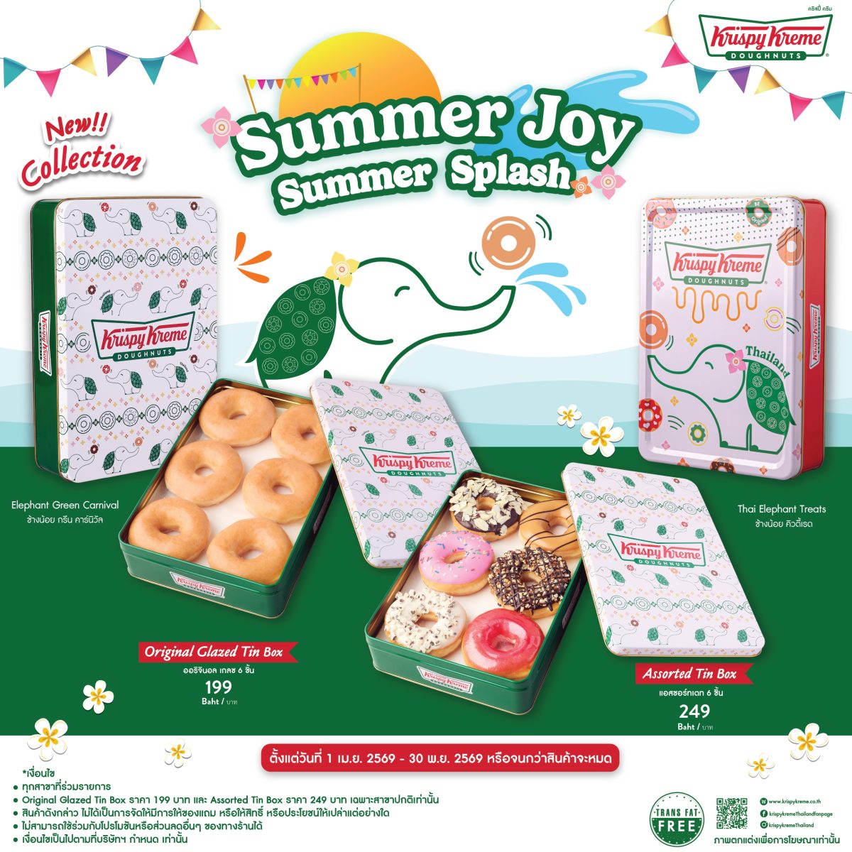 คริสปี้ ครีม ประเทศไทย โดนัทสูตรลิขสิทธิ์อันดับ 1 ที่ครองใจคนทั่วโลก ส่งความสุขรับมหาสงกรานต์ ด้วยทินบ็อกซ์คอลเล็กชัน “Summer Joy Summer Splash” ที่ผสานเอกลักษณ์ความเป็นไทยเข้ากับความสนุกสนานผ่านลวดลายช้างน้อยแบบไทยไทยได้อย่างลงตัว 2 แบบ 2 สไตล์ ได้แก่ กล่อง Thai Elephant treats โทนสีแดงสดใส ตกแต่งเป็นลูกช้างตัวน้อยคู่กับโดนัทหลากสี และทินบ็อกซ์แบบใหม่ล่าสุด Elephant Green Carnival กล่องสีเขียวเข้ม ผสมผสานลวดลายดอกพิกุลที่แสนอ่อนช้อย เข้ากับโดนัทและช้างน้อย ให้ดูสนุกสนานมีชีวิตชีวา เหมาะสำหรับมอบเป็นของขวัญให้กับครอบครัวและคนพิเศษ หรือเก็บสะสมเป็นคอลเล็กชันส่วนตัว ทั้งแบบเซ็ต “Original Glazed Tin Box” โดนัทออริจินอล เกลซ ยอดนิยม จำนวน 6 ชิ้น ในราคา 199 บาท หรือเซ็ต “Assorted Tin Box” ให้คุณเลือกอร่อยกับโดนัทชิ้นโปรด จำนวน 6 ชิ้น ในราคา 249 บาท (ราคาดังกล่าว ยกเว้น สาขาสนามบินสุวรรณภูมิ สนามบินดอนเมือง และแอปพลิเคชันฟู้ดดิลิเวอรี)