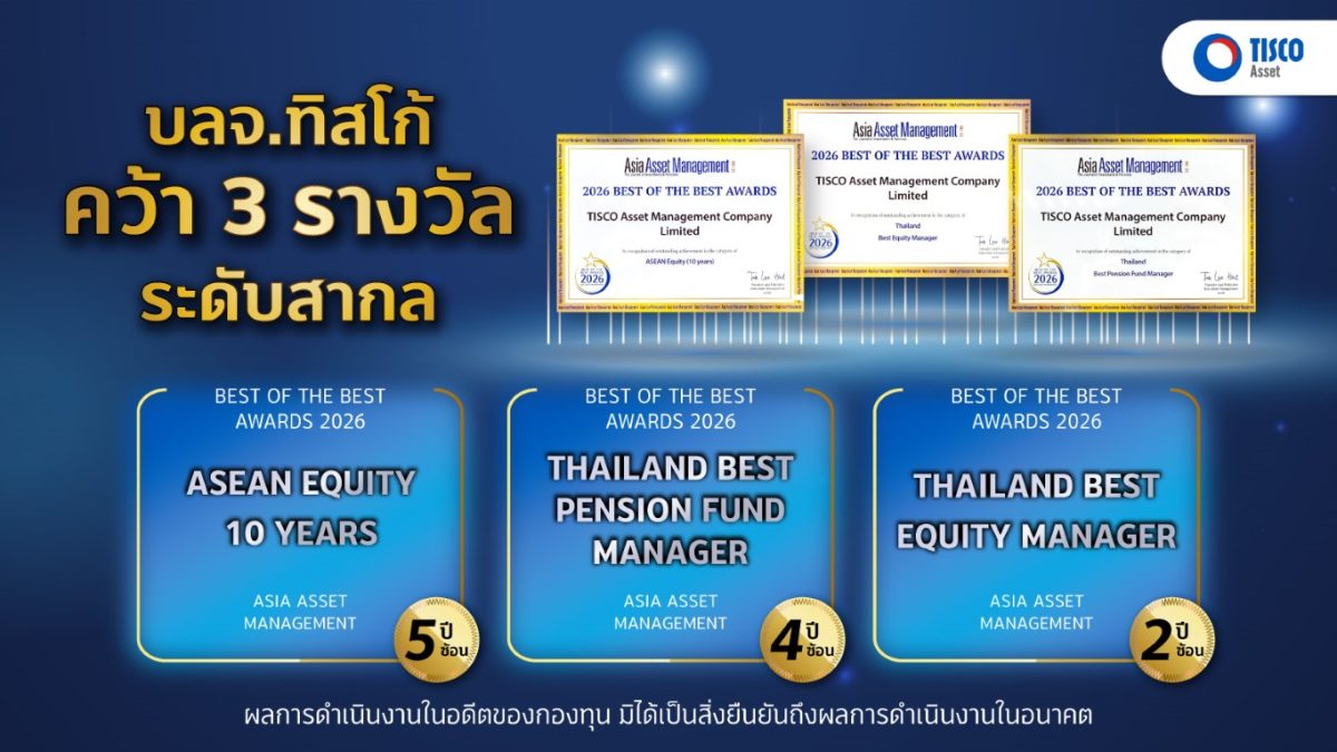 โดยรางวัลที่ได้รับในครั้งนี้ประกอบด้วย 3 รางวัลยอดเยี่ยมจากเวที Best of the Best Awards 2026 จัดโดย Asia Asset Management นิตยสารชั้นนำด้านการลงทุนในภูมิภาคเอเชีย ได้แก่ 1. Best of the Best Performance Awards ในกลุ่ม “ASEAN Equity 10 Years” สะท้อนให้เห็นถึงฝีมือการบริหารกองทุนหุ้นไทย ที่มีผลการดำเนินการย้อนหลัง 10 ปียอดเยี่ยมในระดับอาเซียนต่อเนื่องเป็นปีที่ 5 (2022 – 2026) 2. Thailand Best Pension Fund Manager โดยบลจ. ทิสโก้ได้รับรางวัลนี้ต่อเนื่องเป็นปีที่ 4 (2023-2026) และ 3.Thailand Best Equity Manager รางวัลด้านการบริหารกองทุนตราสารทุนไทยยอดเยี่ยม 2 ปีซ้อน (2025 – 2026)