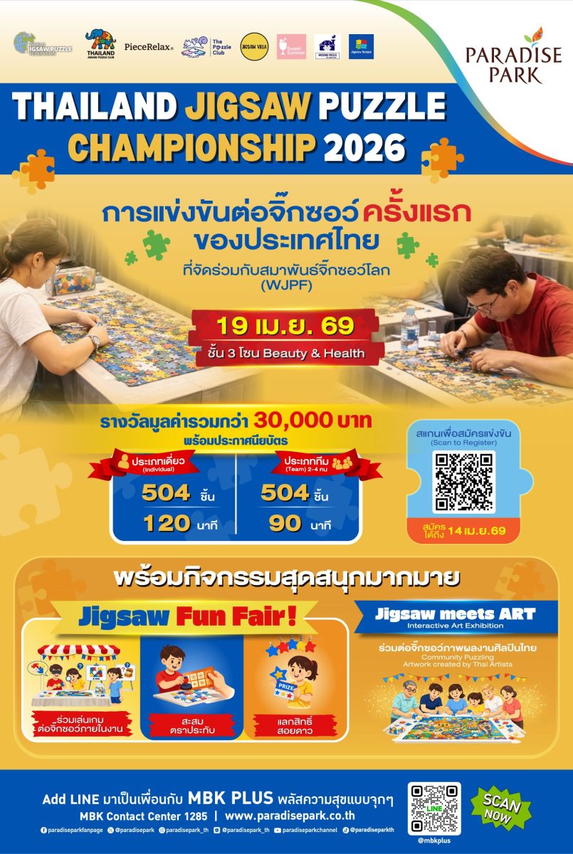 พาราไดซ์ พาร์ค ศูนย์การค้าในเครือเอ็ม บี เค ร่วมกับ สมาพันธ์จิ๊กซอว์โลก (WJPF) เตรียมสร้างปรากฏการณ์ใหม่ให้กับวงการเกมเสริมทักษะงาน “Thailand Jigsaw Puzzle Championship 2026” การแข่งขันต่อ จิ๊กซอว์ครั้งแรกของประเทศไทย ชิงเงินรางวัลรวมมูลค่ากว่า 30,000 บาท พร้อมประกาศนียบัตร