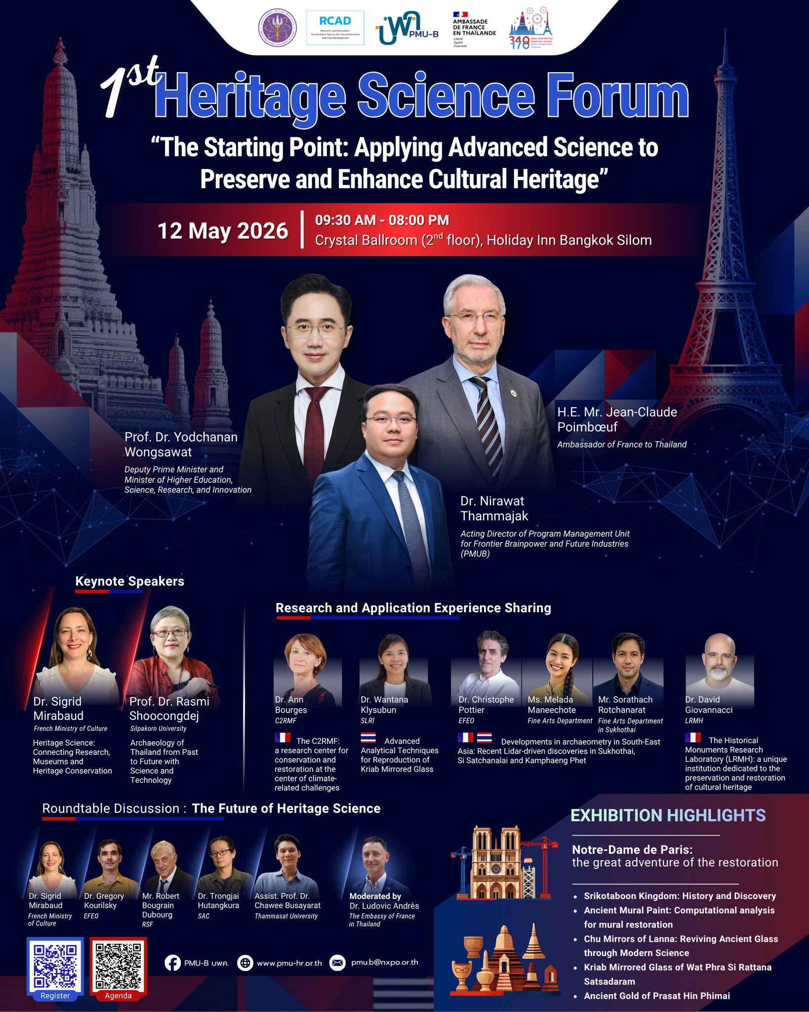 —บพค. (PMUB) ร่วมกับ สถานเอกอัครราชทูตฝรั่งเศสประจำประเทศไทย ขอเชิญทุกท่านเข้าร่วมงานสัมมนาครั้งสำคัญ The 1st Heritage Science Forum “The Starting Point: Applying Advanced Science to Preserve and Enhance Cultural Heritage” ก้าวสำคัญของการผสานพลังระหว่าง “วิทยาศาสตร์ล้ำสมัย” และ “มรดกทางวัฒนธรรม” เพื่อยกระดับการอนุรักษ์และเพิ่มคุณค่าสมบัติของชาติผ่านเทคโนโลยีชั้นสูง มุ่งพัฒนา “กำลังคน” และ “Heritage Science” ของไทยสู่ระดับสากล!