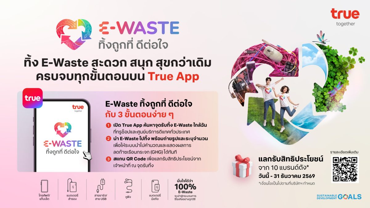 ในปี 2026 นี้ โครงการ “E-Waste ทิ้งถูกที่ ดีต่อใจ” ก้าวสู่มิติใหม่ จากรูปแบบสัญจรส่งรถรับขยะอิเล็กทรอนิกส์ไปยังแลนด์มาร์คต่างๆ สู่ แพลตฟอร์มดิจิทัล ที่ทำให้การทิ้ง E-Waste เป็นเรื่องง่ายยิ่งขึ้นอีก ผ่าน True App แพลตฟอร์มที่เชื่อมต่อผู้ใช้งานกับจุดทิ้งทั่วประเทศ ไม่ว่าจะเป็น ทรูช็อป ทรูแบรนด์ดิ้งช็อป ทรูสเฟียร์ ทรูสเปซ และศูนย์บริการดีแทค ช่วยลดข้อจำกัดด้านการเข้าถึง และเปลี่ยนการจัดการ E-Waste ให้เป็นเรื่อง “ง่ายและเกิดขึ้นได้ในทุกวัน” พร้อมกันนี้ ทรู ยังเพิ่มมิติของความสนุกและความสุขให้ทุกการทิ้งมีความหมายมากยิ่งขึ้น กับแคมเปญ Drop for Rewards ผนึกกับพันธมิตรชั้นนำถึง 10 แบรนด์ดัง ครอบคลุมไลฟ์สไตล์ทั้งอาหาร เครื่องดื่ม ช้อปปิ้ง และบริการต่างๆ ให้ลูกค้าทรู-ดีแทค สามารถเลือกรับสิทธิประโยชน์ที่โดนใจได้ทันที