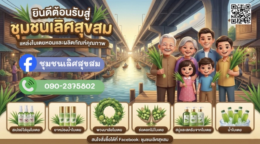 ชุมชนเลิศสุขสมรวมพลังคนในพื้นที่ นำ “ใบเตย” พืชท้องถิ่นที่มีเอกลักษณ์ด้านกลิ่นหอม มาแปรรูปเป็นผลิตภัณฑ์หลากหลาย เพื่อเพิ่มมูลค่า สร้างรายได้ และเสริมความเข้มแข็งให้เศรษฐกิจชุมชน