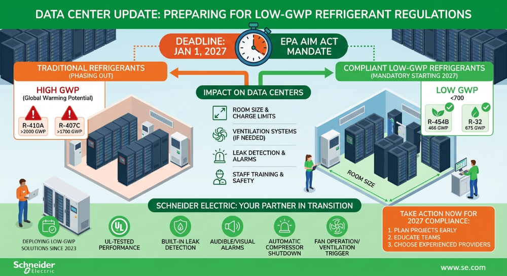 ชไนเดอร์ อิเล็คทริคเล็งเห็นแนวโน้วของข้อกำหนดทางกฎหมายที่กำลังจะเกิดขึ้นเหล่านี้ จึงได้ดำเนินการเตรียมความพร้อมล่วงหน้า โดยปรับโฉมการออกแบบและเริ่มใช้งานระบบทำความเย็นที่ใช้สารทำความเย็นค่า GWP ต่ำ ในดาต้าเซ็นเตอร์ตั้งแต่ปี 2023 ในอเมริกาเหนือ และได้ขยายการใช้งานยูนิตเพิ่มเติมในยุโรปช่วงปี 2024 เป็นต้นมา