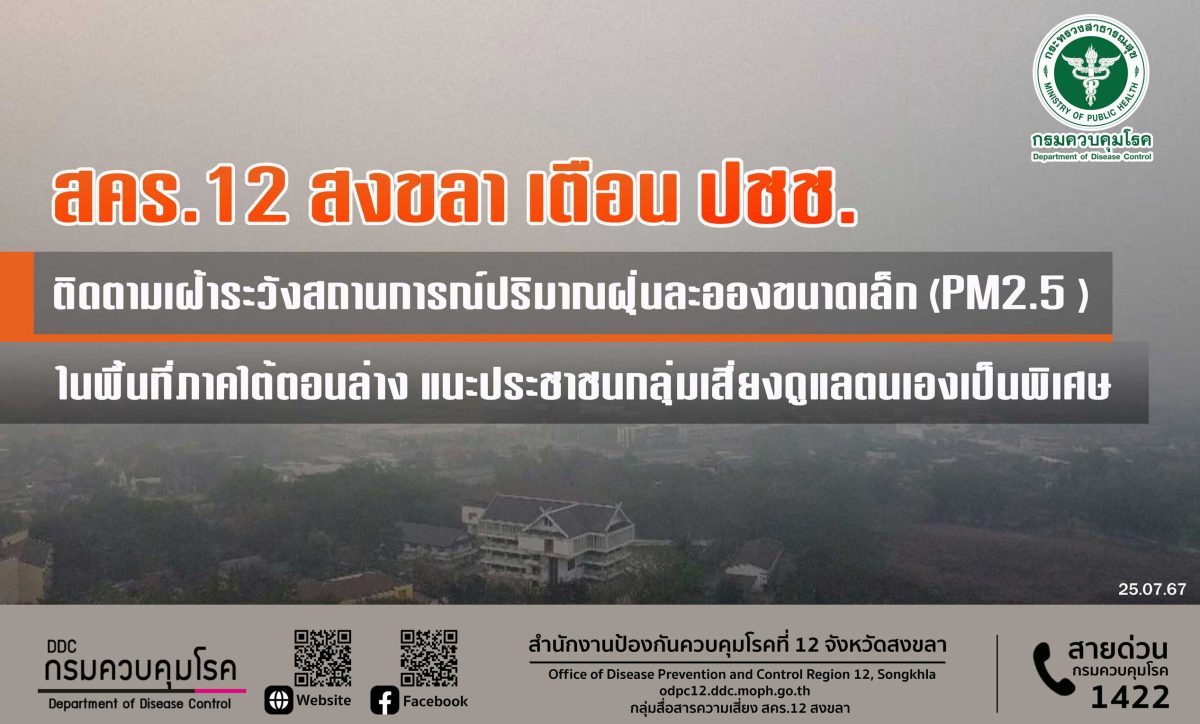 สำนักงานป้องกันควบคุมโรคที่ 12 จังหวัดสงขลา (สคร.12 สงขลา) เตือนประชาชนติดตามเฝ้าระวังสถานการณ์ปริมาณฝุ่นละอองขนาดเล็ก (PM 2.5) ในพื้นที่ภาคใต้ตอนล่าง แนะประชาชนกลุ่มเสี่ยงดูแลตนเองเป็นพิเศษ
