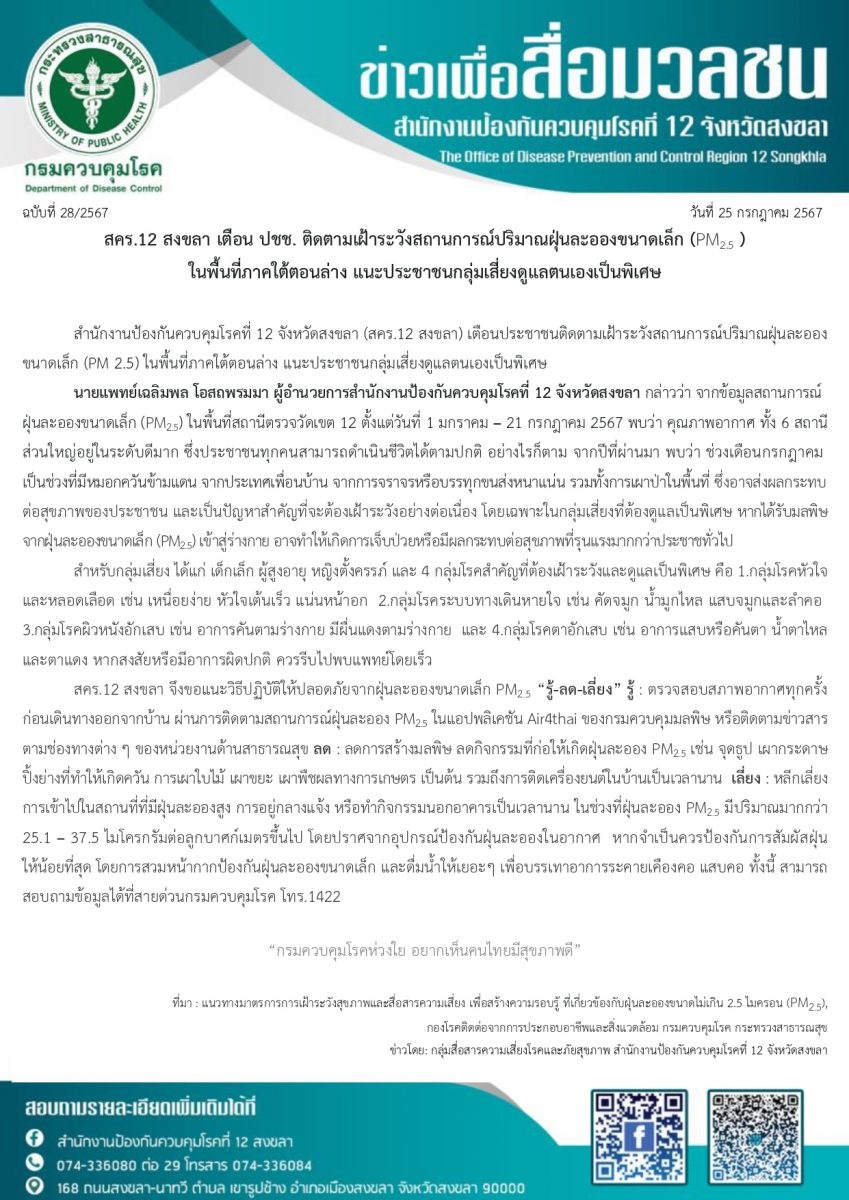 นายแพทย์เฉลิมพล โอสถพรมมา ผู้อำนวยการสำนักงานป้องกันควบคุมโรคที่ 12 จังหวัดสงขลา กล่าวว่าจากข้อมูลสถานการณ์ฝุ่นละอองขนาดเล็ก (PM2.5) ในพื้นที่สถานีตรวจวัดเขต 12 ตั้งแต่วันที่ 1 มกราคม – 21 กรกฎาคม 2567 พบว่า คุณภาพอากาศ ทั้ง 6 สถานี ส่วนใหญ่อยู่ในระดับดีมาก ซึ่งประชาชนทุกคนสามารถดำเนินชีวิตได้ตามปกติ อย่างไรก็ตาม จากปีที่ผ่านมา พบว่า ช่วงเดือนกรกฎาคมเป็นช่วงที่มีหมอกควันข้ามแดน จากประเทศเพื่อนบ้าน จากการจราจรหรือบรรทุกขนส่งหนาแน่น รวมทั้งการเผาป่าในพื้นที่ ซึ่งอาจส่งผลกระทบต่อสุขภาพของประชาชน และเป็นปัญหาสำคัญที่จะต้องเฝ้าระวังอย่างต่อเนื่อง โดยเฉพาะในกลุ่มเสี่ยงที่ต้องดูแลเป็นพิเศษ หากได้รับมลพิษจากฝุ่นละอองขนาดเล็ก (PM2.5) เข้าสู่ร่างกาย อาจทำให้เกิดการเจ็บป่วยหรือมีผลกระทบต่อสุขภาพที่รุนแรงมากกว่าประชาชนทั่วไป