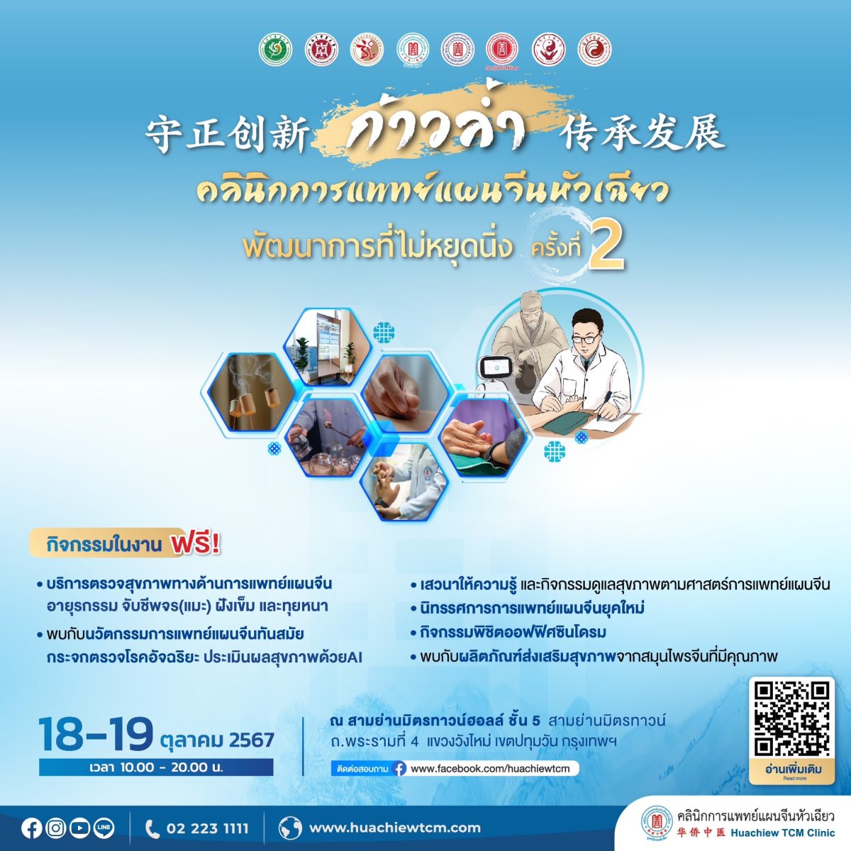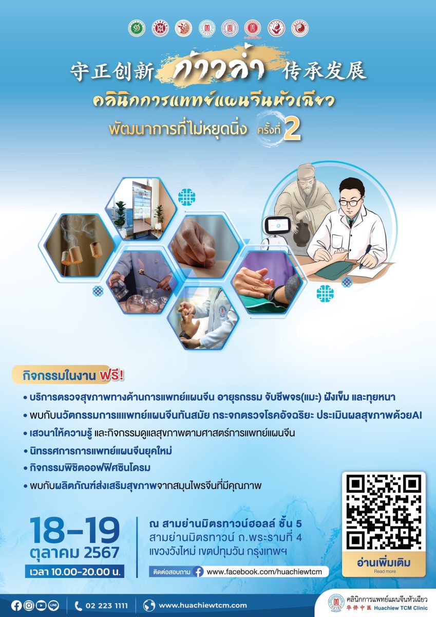 แล้วพบกันในงาน“ก้าวล้ำ คลินิกการแพทย์แผนจีนหัวเฉียว พัฒนาการที่ไม่หยุดนิ่ง” ครั้งที่ 2 ร่วมสัมผัสอนาคตของการแพทย์แผนจีนยุคใหม่ ระหว่างวันที่ 18-19 ตุลาคม 2567 เวลา 10.00-20.00 น. ณ สามย่านมิตรทาวน์ฮอลล์ ชั้น 5 สามย่านมิตรทาวน์ สามารถติดตามข้อมูลเพิ่มเติมได้ทาง Facebook : หัวเฉียวแพทย์แผนจีน กรุงเทพ Huachiew TCM Clinic