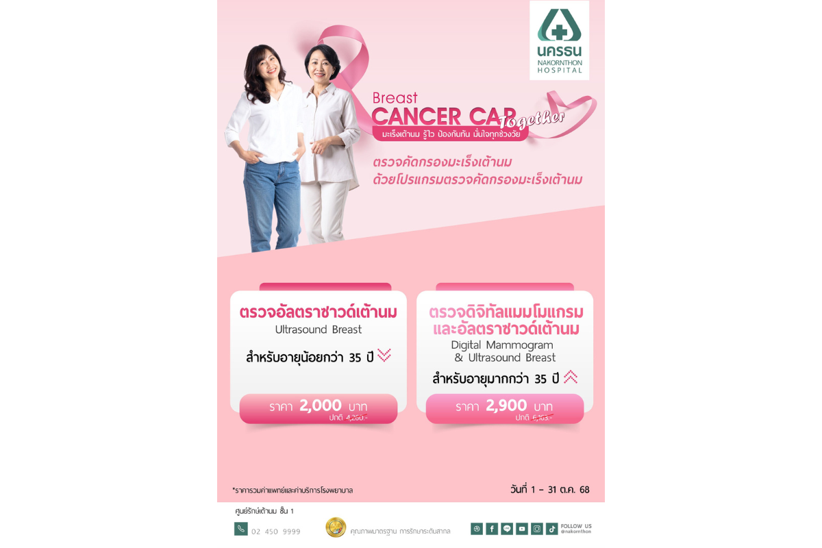 ทั้งนี้ เพื่อรณรงค์วันมะเร็งเต้านมโลก ซึ่งตรงกับวันที่ 7 ตุลาคมของทุกปี โรงพยาบาลนครธน ได้จัดโปรแกรมตรวจคัดกรองมะเร็งเต้านม 1. ตรวจอัลตราซาวด์เต้านม ราคา 1,900 บาท 2. ตรวจด้วยเครื่องดิจิทัลแมมโมแกรมและอัลตราซาวด์เต้านม ราคา 2,900 บาท เปิดให้สั่งซื้อผ่านเว็บไซต์ www.nakornthon.com ตั้งแต่วันที่ 1 – 31 ตุลาคม 2568