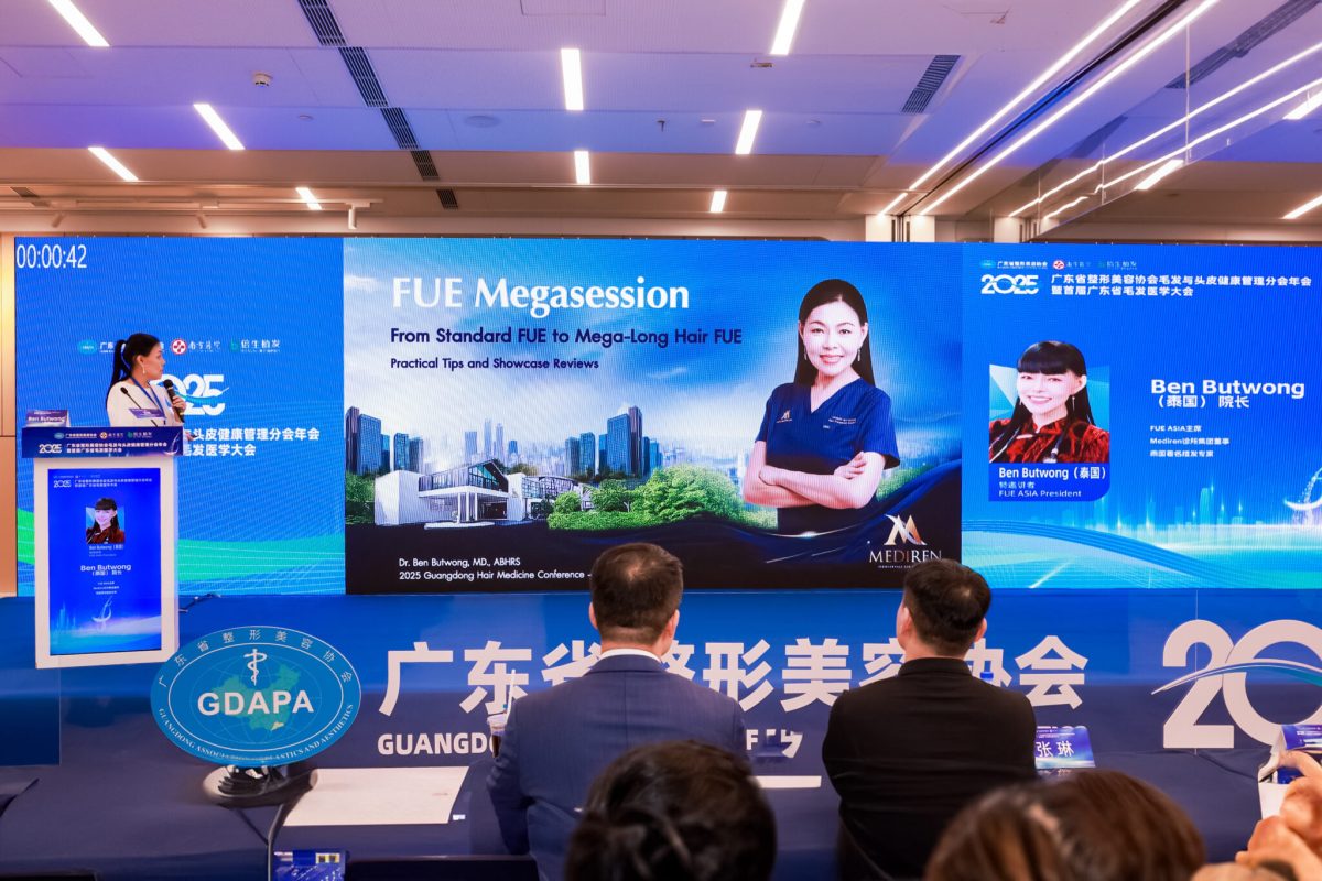 ในการประชุมวิชาการระดับนานาชาติ ซึ่งจัดโดยสมาคมศัลยกรรมตกแต่งและความงามกวางตุ้ง ร่วมกับสมาคมเวชศาสตร์เส้นผมมณฑลกวางตุ้ง ณ ศูนย์การประชุมนานาชาติกวางโจว ประเทศจีน ได้ให้เกียรติเชิญ พญ.เบญ บุตรวงศ์ ประธานสมาคมแพทย์ปลูกผมเอเชีย FUE Asia และศัลยแพทย์ปลูกผมแนวหน้าของไทย ขึ้นบรรยายในหัวข้อ “FUE Megasession: From Standard FUE to Mega-Long Hair – Practical Tips and Showcase Reviews” สะท้อนให้เห็นถึงความเชื่อมั่นของประเทศจีนต่อฝีมือและมาตรฐานทางการแพทย์ของไทย โดยเฉพาะการถ่ายทอดองค์ความรู้และเทคนิคการปลูกผมขั้นสูง (FUE Megasession) ที่กำลังเป็นที่นิยมในตลาดเอเชีย