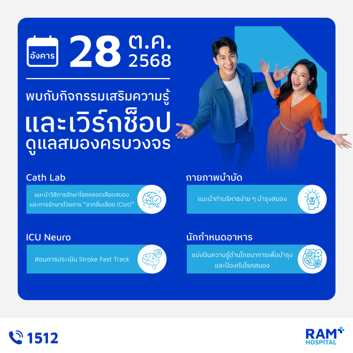 กิจกรรมพิเศษ วันอังคารที่ 28 ตุลาคม 2568 ตั้งแต่เวลา 08.00-15.00 น.กิจกรรมเสริมความรู้และเวิร์กช็อปดูแลสมองครบวงจร ที่จะช่วยให้คุณเข้าใจการดูแลสมองได้ดียิ่งขึ้น
