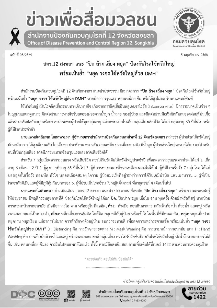 สำนักงานป้องกันควบคุมโรคที่ 12 จังหวัดสงขลา แนะนำประชาชน ยึดมาตรการ “ปิด ล้าง เลี่ยง หยุด” ป้องกันโรคไข้หวัดใหญ่ พร้อมเน้นย้ำ “หยุด วงจร ไข้หวัดใหญ่ด้วย DMH” หากมีอาการรุนแรง หอบเหนื่อย ซึม หรือไข้สูงไม่ลด รีบพบแพทย์ทันที