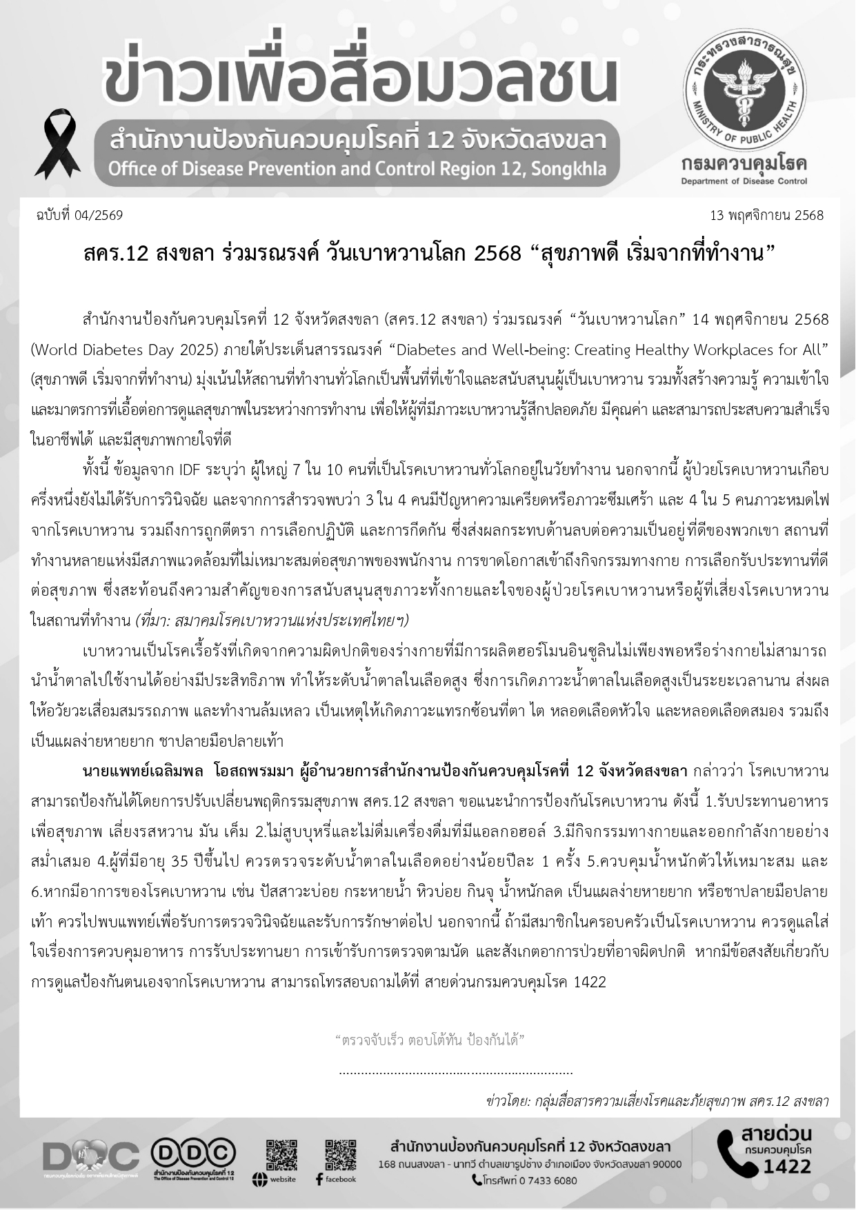 สำนักงานป้องกันควบคุมโรคที่ 12 จังหวัดสงขลา (สคร.12 สงขลา) ร่วมรณรงค์ “วันเบาหวานโลก” 14 พฤศจิกายน 2568 (World Diabetes Day 2025) ภายใต้ประเด็นสารรณรงค์ “Diabetes and Well-being: Creating Healthy Workplaces for All” (สุขภาพดี เริ่มจากที่ทำงาน) มุ่งเน้นให้สถานที่ทำงานทั่วโลกเป็นพื้นที่ที่เข้าใจและสนับสนุนผู้เป็นเบาหวาน รวมทั้งสร้างความรู้ ความเข้าใจ และมาตรการที่เอื้อต่อการดูแลสุขภาพในระหว่างการทำงาน เพื่อให้ผู้ที่มีภาวะเบาหวานรู้สึกปลอดภัย มีคุณค่า และสามารถประสบความสำเร็จในอาชีพได้ และมีสุขภาพกายใจที่ดี