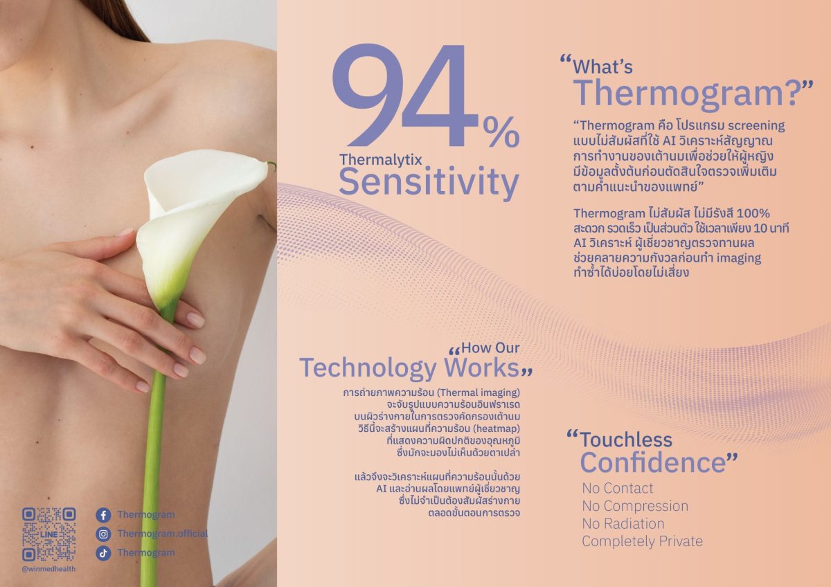 Thermogram ทำงานโดยอาศัยหลักการตรวจจับความร้อนอินฟราเรดบนพื้นผิวเต้านม โดยไม่สัมผัสร่างกาย ไม่มีการบีบอัด ไม่ต้องใช้รังสี และใช้เวลาเพียง 10 นาที เซลล์มะเร็งหรือเนื้อเยื่อผิดปกติมักมีอุณหภูมิสูงกว่าปกติ ระบบ AI ของเทคโนโลยี Thermalytix® จะช่วยวิเคราะห์และประเมินความเสี่ยงได้อย่างแม่นยำตั้งแต่ระยะเริ่มต้น โดยผลการตรวจจะได้รับการยืนยันโดยรังสีแพทย์ผู้เชี่ยวชาญก่อนส่งถึงผู้รับบริการ ทำให้ Thermogram เป็นอีกหนึ่งทางเลือกสำคัญสำหรับการคัดกรองความเสี่ยงที่สะดวกสบาย ปลอดภัย และราคาที่เข้าถึงได้ง่ายกว่า เหมาะสำหรับผู้หญิงทุกช่วงวัยและทุกความหนาแน่นของเต้านม
