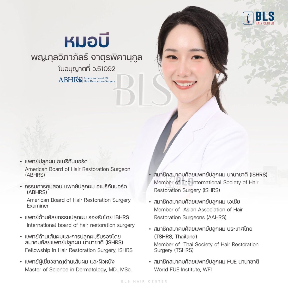 “หมอและทีม BLS ยึดหลักมาตรฐานของ ABHRS ในทุกขั้นตอนของการดูแลคนไข้ ตั้งแต่การวินิจฉัย การออกแบบแนวผม ไปจนถึงการปลูกผม เพื่อให้ผลลัพธ์ออกมาดีที่สุดและปลอดภัยที่สุดเสมอ”