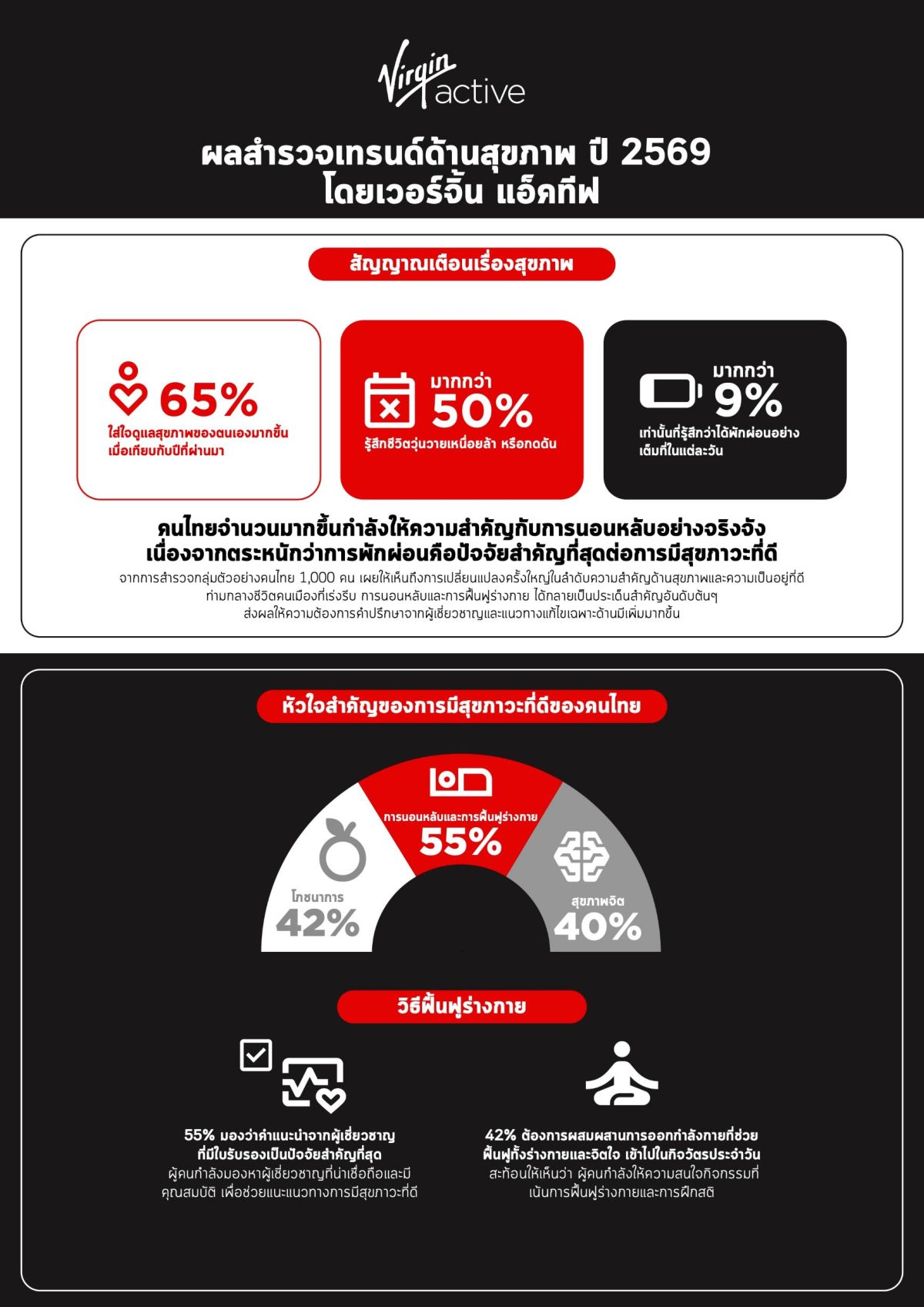 เวอร์จิ้น แอ็คทีฟ ประเทศไทย คลับดูแลสุขภาพแบบองค์รวม เผยในผลการสำรวจล่าสุดว่า “คุณภาพการนอนหลับ การฟื้นฟูร่างกาย และโภชนาการ” คือสามปัจจัยหลักที่คนไทยให้ความสำคัญสูงสุดในปัจจุบัน ท่ามกลางวิถีชีวิตคนเมืองที่เร่งรีบและวุ่นวาย ผลสำรวจยังชี้ให้เห็นถึงความต้องการคำแนะนำจากผู้เชี่ยวชาญที่เพิ่มมากขึ้น และเทรนด์การออกกำลังกายแบบผสมผสานกายใจ (mind-body exercises) เข้ามาเป็นส่วนหนึ่งของกิจวัตรประจำวันเพื่อยกระดับคุณภาพชีวิตให้ดียิ่งขึ้น