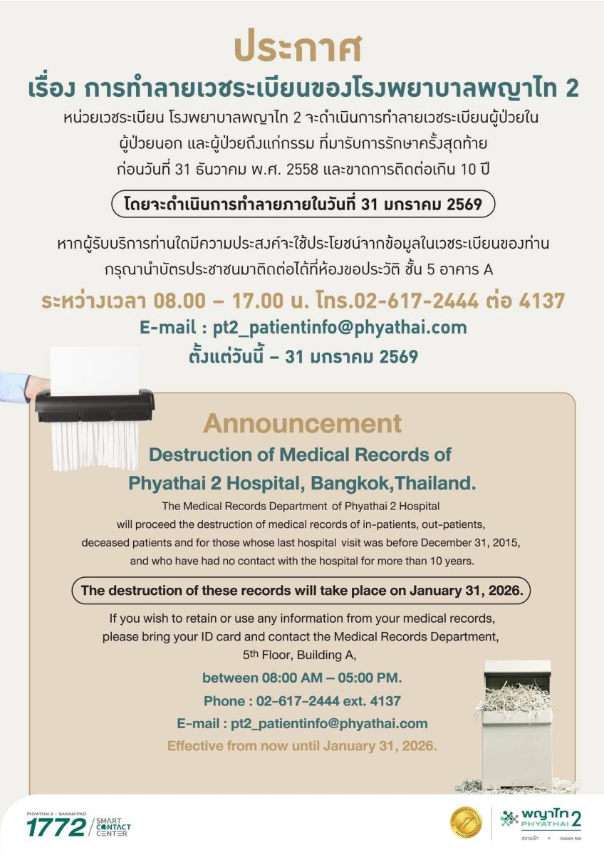 โรงพยาบาลพญาไท 2 ถนนพหลโยธิน แขวงและเขตพญาไท กรุงเทพมหานคร ได้ออกประกาศเรื่องการทำลายแฟ้มเวชระเบียน โดยหน่วยเวชระเบียนของโรงพยาบาลพญาไท 2 จะดำเนินการทำลายแฟ้มเวชระเบียนผู้ป่วยนอกและผู้ป่วยในที่มารับบริการครั้งสุดท้ายก่อนวันที่ 31 ธันวาคม 2568 และขาดการติดต่อเกิน 10 ปี