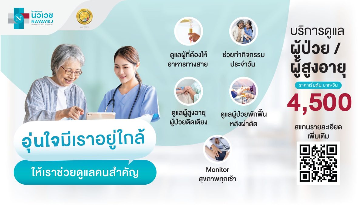 เพื่อให้การดูแลได้อย่างปลอดภัย อุ่นใจ และมีคุณภาพชีวิตที่ดีในทุกวัน ซึ่งแพ็กเกจบริการดูแลผู้ป่วยหรือผู้สูงอายุ มีบริการแบบ รายวัน/รายเดือน ราคาเริ่มต้น 4,500 บาท/วัน ดูรายละเอียด คลิก: https://bit.ly/3KqMcyQ  โดยเงื่อนไขการให้บริการเป็นไปตามที่ รพ. กำหนด ทั้งนี้โรงพยาบาลนวเวชให้ความสำคัญกับคุณภาพการรักษา มาตรฐานการให้บริการ ระบบการดูแลผู้ป่วยด้วยบุคลากรที่มีคุณภาพ และผ่านการรับรองมาตรฐาน AACI (American Accreditation Commission International) ประเทศสหรัฐอเมริกา ค.ศ 2025 รวมถึง โปรแกรมการรับรอง AACI “ความเป็นเลิศด้านสตรีมีครรภ์” AACI Clinical Excellence Certification Maternity Services ค.ศ 2025, ISO 7101:2023 – Health Care Organization Management และ ISO 9001:2015 – Quality Management Systems  หากมีข้อสงสัยสามารถติดต่อสอบถามหรือนัดหมายปรึกษาได้ที่ โรงพยาบาลนวเวช โทร.1507 Line: @navavej