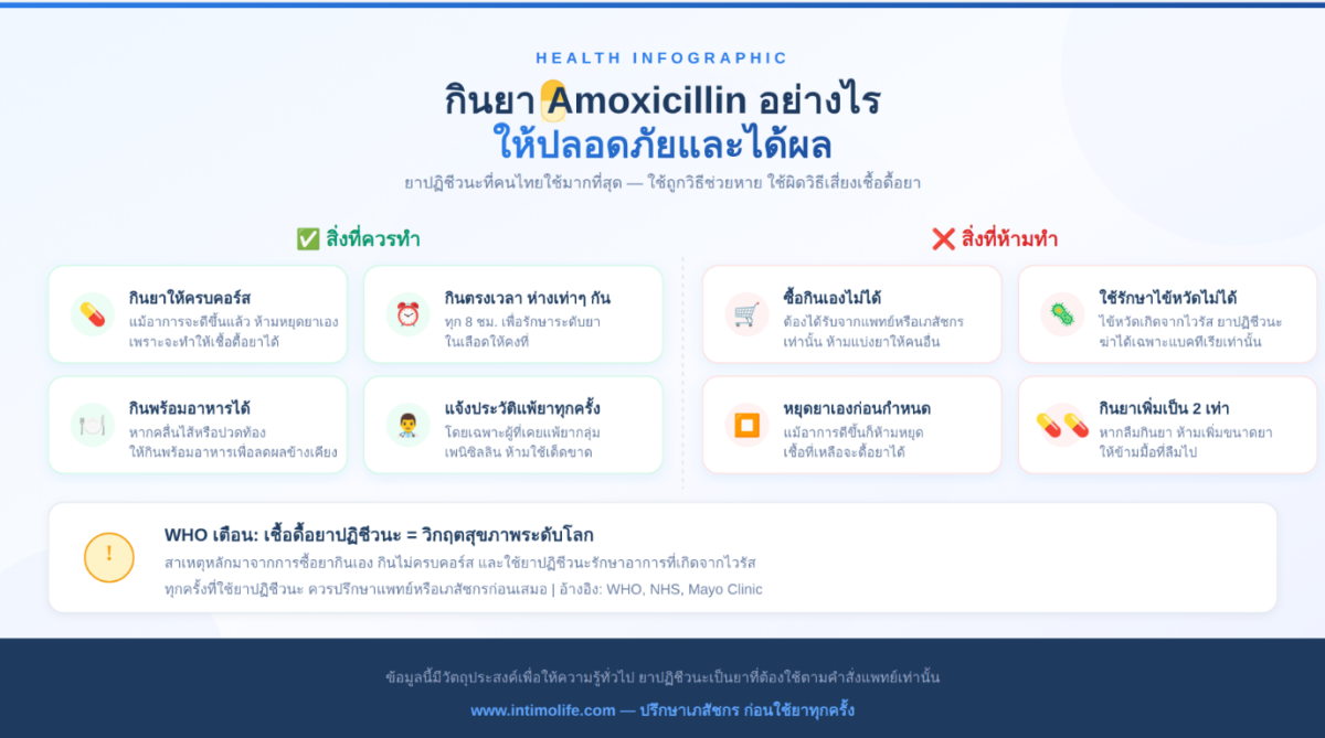 หากลืมกินยา ให้รับประทานทันทีที่นึกได้ แต่ถ้าใกล้เวลามื้อถัดไปแล้ว ให้ข้ามมื้อที่ลืมไปเลย ห้ามกินยาเพิ่มเป็นสองเท่าเด็ดขาด ผู้ที่ต้องการศึกษาข้อมูลเชิงลึกเกี่ยวกับ Amoxicillin ทั้งวิธีกิน ขนาดยา และข้อควรระวัง สามารถอ่านเพิ่มเติมจากแหล่งข้อมูลที่อ้างอิงตามหลักวิชาการได้