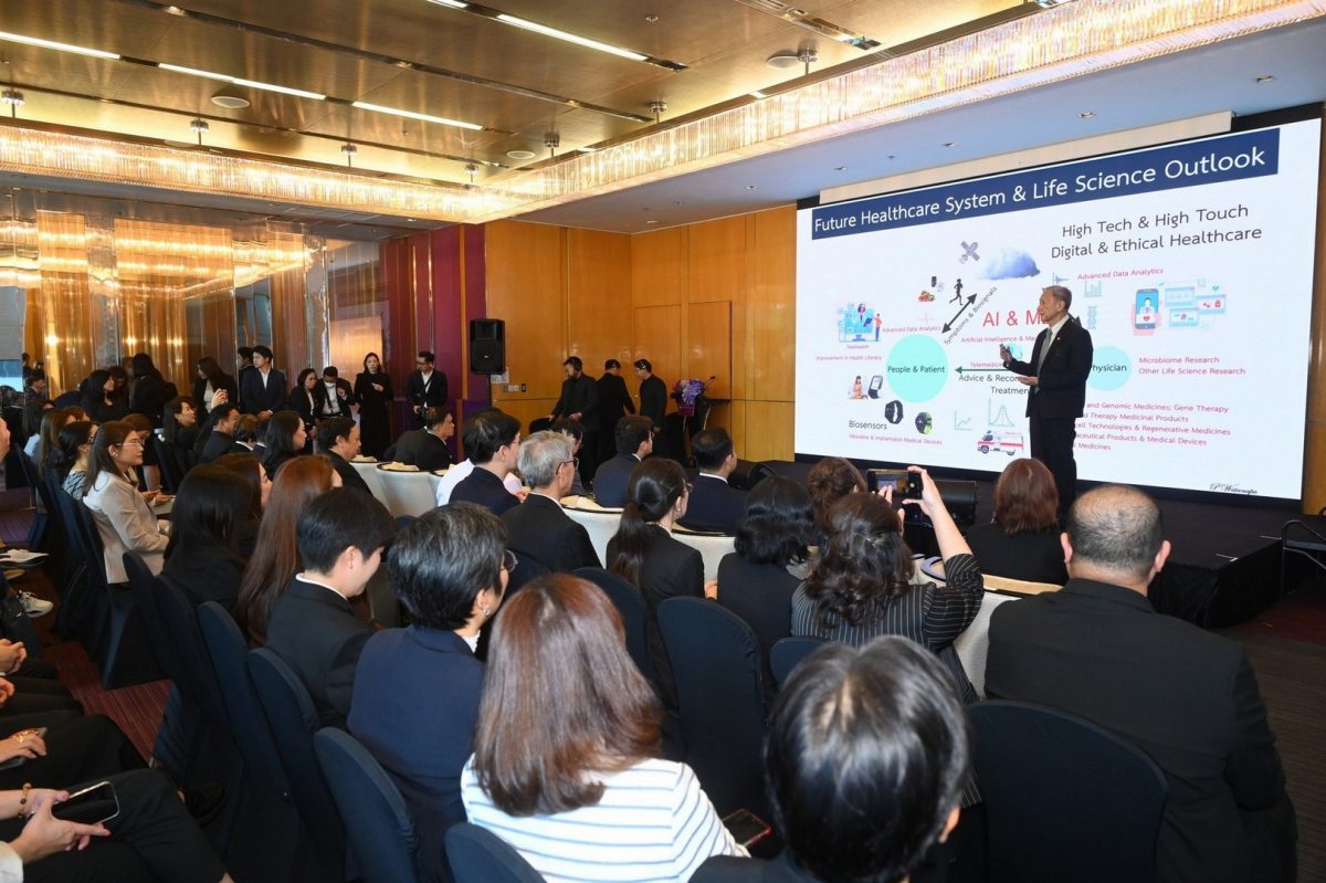 ในงาน ยังได้รับเกียรติจาก ศ.ดร.นพ.ประสิทธิ์ วัฒนาภา ประธานกรรมการ สำนักงานเทคโนโลยีและนวัตกรรมด้านชีววิทยาศาสตร์ (องค์การมหาชน) ร่วมกล่าวปาฐกถาในหัวข้อ “นวัตกรรมการแพทย์ดิจิทัล: พลังขับเคลื่อนสู่สังคมสุขภาพดีของไทย ก้าวไกลสู่เวทีโลก” โดยชี้ให้เห็นว่า การยกระดับระบบนิเวศนวัตกรรมสุขภาพของไทยให้เติบโตอย่างแข็งแกร่งและยั่งยืน จำเป็นต้องอาศัยความร่วมมือจากภาครัฐ ภาคเอกชน และสตาร์ตอัปด้านสุขภาพ เพื่อผลักดันนวัตกรรมและเทคโนโลยีทางการแพทย์ เช่น การวินิจฉัยโรคด้วย AI และเครื่องมือดิจิทัลความแม่นยำสูง แนวทางดังกล่าวเป็นรากฐานสำคัญของการดูแลสุขภาพเชิงรุก ช่วยยกระดับคุณภาพการรักษา ลดภาระระบบโรงพยาบาล และขยายการเข้าถึงบริการสุขภาพของประชาชนทั่วประเทศ อันจะนำไปสู่การยกระดับคุณภาพชีวิตของคนไทย พร้อมต่อยอดเทคโนโลยีการแพทย์ของไทยสู่การยอมรับในระดับสากล