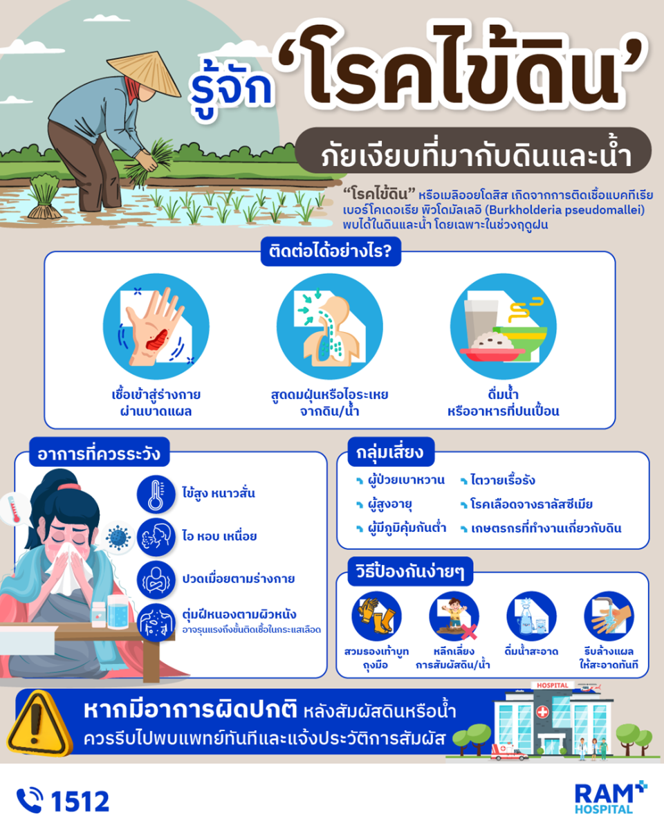 รู้จัก ‘โรคไข้ดิน’ ภัยเงียบที่มากับดินและน้ำ ไข้นานไม่หาย… ไอเรื้อรัง… อ่อนเพลียโดยไม่ทราบสาเหตุ หลายคนอาจคิดว่าเป็นเพียงการติดเชื้อทั่วไป แต่ในความเป็นจริง อาการเหล่านี้อาจเป็นสัญญาณของ “โรคไข้ดิน” (Melioidosis) ที่เกิดจากการติดเชื้อแบคทีเรียชื่อ Burkholderia pseudomallei ซึ่งพบได้ตามธรรมชาติใน “ดิน” และ “น้ำ”สัญญาณเตือน: -เป็นไข้นานไม่ทราบสาเหตุ -อ่อนเพลีย น้ำหนักลดไอ มีเสมหะ เจ็บหน้าอก -บางรายไอมีเลือดปนมีฝีหนองตามผิวหนัง แผลเรื้อรังบางรายอาจมีการติดเชื้อในกระแสเลือดและเสียชีวิต หากมีอาการเข้าข่าย ควรรีบพบแพทย์ทันที เพราะโรคนี้รักษาให้หายขาดได้หากตรวจพบเร็ว!