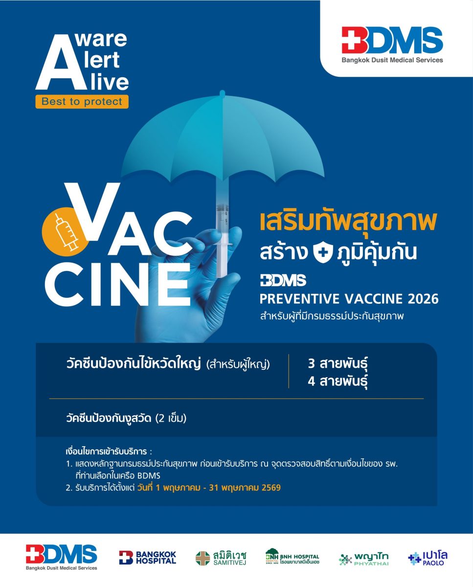 BDMS ในฐานะผู้ประกอบการกลุ่มธุรกิจบริการสุขภาพครบวงจรและใหญ่ที่สุดในประเทศไทย ให้ความสำคัญกับการส่งเสริมสุขภาพเชิงป้องกันมาอย่างต่อเนื่อง โดยเดินหน้าขับเคลื่อนแคมเปญ “BDMS PREVENTIVE VACCINE 2026” เพื่อสะท้อนความมุ่งมั่นในการสนับสนุนการดูแลสุขภาพเชิงป้องกันอย่างเป็นระบบ มุ่งเสริมสร้างภูมิคุ้มกัน ลดความเสี่ยงของการเกิดโรค และช่วยลดภาระค่ารักษาพยาบาลในระยะยาว ควบคู่กับการส่งเสริมแนวทางการดูแลสุขภาพที่ยั่งยืน สอดคล้องกับทิศทาง Preventive Healthcare ที่ได้รับความสำคัญเพิ่มขึ้นในปัจจุบัน
