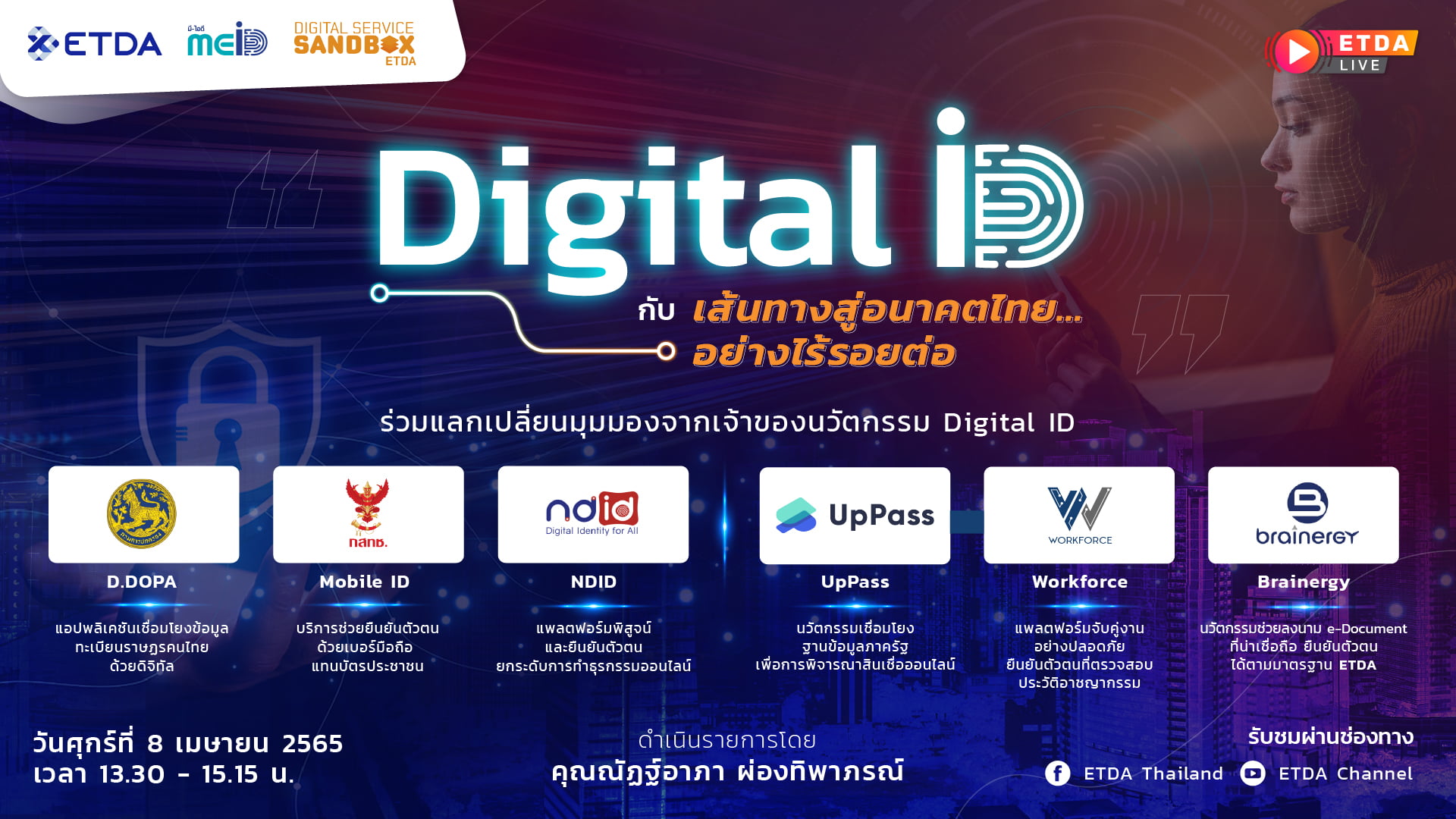 สำหรับคนที่สนใจสามารถเข้าร่วมรับชม ETDA Live “Digital ID กับเส้นทางสู่อนาคตไทย… อย่างไร้รอยต่อ” พร้อมกันได้ ในวันศุกร์ที่ 8 เมษายน 2565 เวลา 13.30-15.15 ที่เพจ ETDA Thailand https://www.facebook.com/ETDA.Thailand)