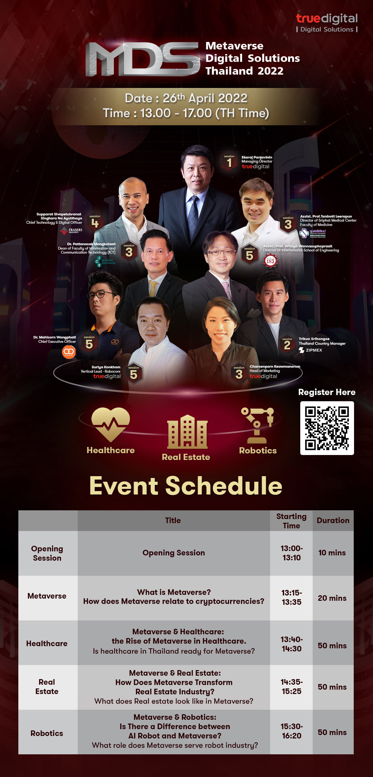 ทรู ดิจิทัล โซลูชัน ขอเชิญผู้ที่สนใจร่วมงาน “Metaverse & Digital Solutions (MDS) Thailand 2022“ วันที่ 26 เมษายน 2565 เวลา 13:00-17:00 น. งานสัมมนาออนไลน์ด้าน Metaverse และ Digital Solutions พบกูรูผู้เชี่ยวชาญกว่า 14 ท่าน ในด้านนวัตกรรมที่เกี่ยวข้องกับ Metaverse และ Digital Solutions ในอุตสาหกรรมหลัก อาทิ อสังหาริมทรัพย์ การแพทย์ และหุ่นยนต์ ที่จะมาแชร์มุมมองและวิสัยทัศน์ พร้อมอัพเดทเทรนดิจิทัลล่าสุด โดยงานนี้ มีผู้เข้าร่วมงานกว่า 400 ท่าน