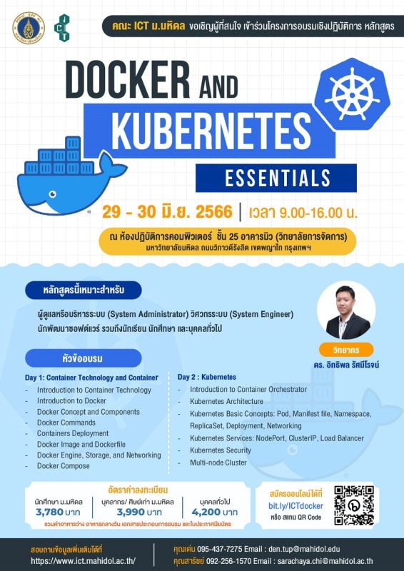คณะ ICT ม. มหิดล จัดอบรมเกี่ยวกับเทคโนโลยี Container ขั้นพื้นฐาน ในหลักสูตร “Docker & Kubernetes Essentials” เป็นเวลา 2 วัน ๆ ละ 6 ชม. โดยในหลักสูตร จะประกอบไปด้วยเนื้อหาด้านทฤษฎีให้เข้าใจถึงหลักการ แนวคิดที่สำคัญของเทคโนโลยี Container และเนื้อหาด้านการฝึกปฏิบัติให้ลองการใช้งานจริง โดยในวันแรกจะเป็นเนื้อหาเกี่ยวกับเทคโนโลยี Container และ Docker และวันที่สองจะเป็นเนื้อหาเกี่ยวกับ Kubernetes โดยทั้งสองตัวเป็นซอร์ฟแวร์ที่เป็นที่นิยมที่สุดในการทำ Containers และ Container Orchestrator