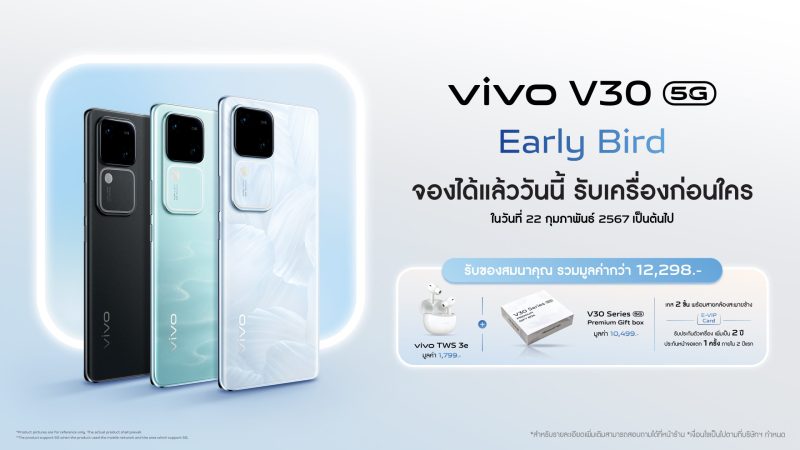 พิเศษสำหรับแฟน ๆ วีโว่ vivo V30 5G และ V30 Pro 5G จะเปิดให้ผู้ที่สนใจได้จับจองเป็นเจ้าของก่อนใครในรอบ Early Bird โดยมีรายละเอียดดังนี้