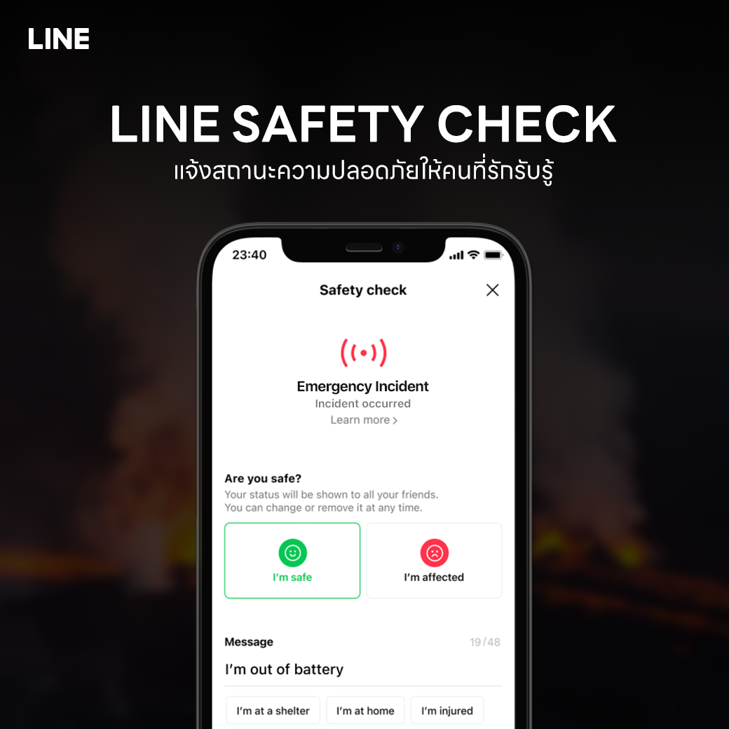 LINE Safety Check คือ ฟีเจอร์ยืนยันความปลอดภัยที่ LINE พัฒนาขึ้นเพื่อให้ประชาชนสามารถแจ้ง”สถานะความปลอดภัย”ของตนเอง ได้ทันทีเมื่อเกิดเหตุภัยพิบัติ ผ่านแพลตฟอร์ม LINE ที่ใช้งานอยู่ทุกวัน โดยระบบจะแสดงแบนเนอร์แจ้งเตือนภายในแอปเมื่อเกิดเหตุภัยพิบัติ ผ่านการรับข้อมูลที่รับรองจากหน่วยงานภาครัฐที่เกี่ยวข้อง ลดความเสี่ยงจากข่าวลวงหรือข้อมูลคลาดเคลื่อน ผู้ใช้สามารถกดรายงานสถานะของตนเอง ซึ่งเพื่อนบน LINE ไม่ว่าจะเป็นครอบครัวและคนใกล้ชิดจะสามารถเห็นได้อย่างรวดเร็วและชัดเจน โดยฟีเจอร์นี้ได้รับการออกแบบให้ใช้งานง่าย ไม่ต้องติดตั้งหรือสมัครบริการเพิ่มเติม และมีชุดข้อความพร้อมใช้ตามลักษณะเหตุการณ์ รวมถึงมีข้อมูลข่าวสารเกี่ยวสถานการณ์ที่ได้รับการตรวจสอบความน่าชื่อถือแล้ว เพื่อช่วยให้การสื่อสารในช่วงสถานการณ์วิกฤติเป็นไปอย่างถูกต้องและมีประสิทธิภาพ