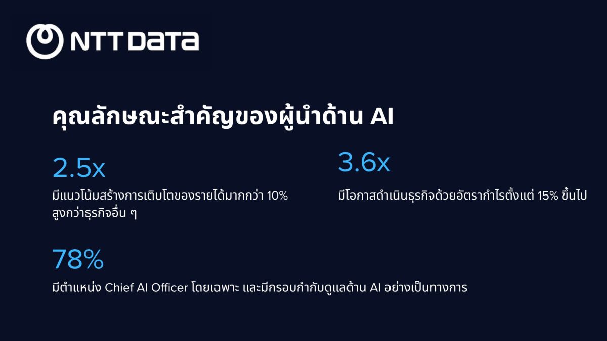 นาย ยูทากะ ซาซากิ ประธานและซีอีโอของ NTT DATA Group กล่าวว่า “ความรับผิดชอบด้าน AI ในวันนี้ไม่ใช่เรื่องของฝ่ายไอทีเพียงอย่างเดียว แต่เป็นวาระระดับคณะกรรมการบริหาร งานวิจัยของเราชี้ให้เห็นว่า ผู้นำด้าน AI คือองค์กรที่ใช้ AI เพื่อสร้างความแตกต่าง สร้างการเติบโต และออกแบบความร่วมมือระหว่างมนุษย์กับเทคโนโลยีขึ้นมาใหม่อย่างเป็นระบบ”