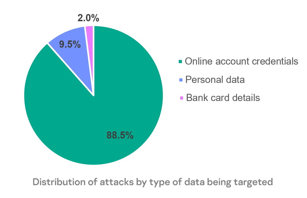 จากผลการวิจัยของแคสเปอร์สกี้พบว่า การโจมตีแบบฟิชชิงถึง 88.5% มุ่งเป้าไปที่ข้อมูลประจำตัวบัญชีออนไลน์ 9.5% มุ่งเป้าไปที่ข้อมูลส่วนบุคคล เช่น ชื่อ ที่อยู่ และวันเกิด และ 2% มุ่งเป้าไปที่ข้อมูลบัตรธนาคาร เมื่ออาชญากรไซเบอร์ได้ข้อมูลส่วนบุคคลเหล่านี้แล้ว ข้อมูลจะถูกส่งผ่านระบบอัตโนมัติเฉพาะทางที่ช่วยจัดการข้อมูลจำนวนมาก ระบบเหล่านี้ให้บริการในรูปแบบแพลตฟอร์มเป็นบริการ (Platform-as-a-Service หรือ PaaS) ซึ่งอาจสร้างขึ้นโดยผู้โจมตีเองหรืออิงตามเฟรมเวิร์กที่ถูกต้องตามกฎหมายสำหรับการสร้างเว็บไซต์หรือแอปพลิเคชัน