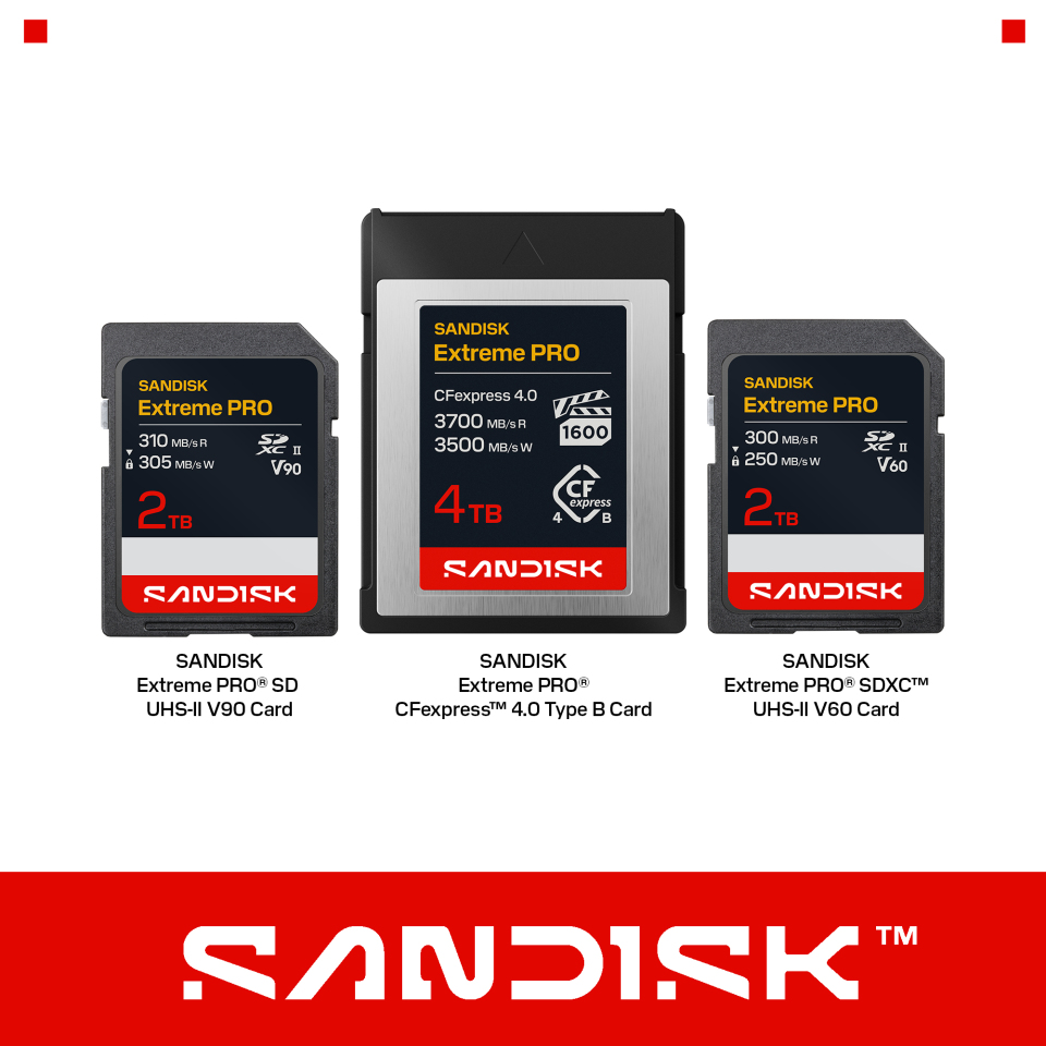 - การ์ดหน่วยความจำรุ่นล่าสุดจาก Sandisk ที่มอบความเร็วในการอ่านสูงสุดถึง 3,700MB/s และความเร็วในการเขียนสูงสุด 3,500MB/s พร้อมประสิทธิภาพการเขียนแบบต่อเนื่องที่ออกแบบมาเพื่อรองรับการบันทึกวิดีโอแบบบิตเรตสูงได้อย่างมีเสถียรภาพ อีกทั้งยังรองรับความจุสูงสุดถึง 4TB รองรับการบันทึกต่อเนื่องได้ยาวนานขึ้น และการถ่ายทำความเร็วสูงในระดับความละเอียด 12K
