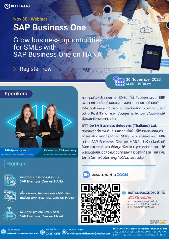 NDBS Thailand เชิญร่วมงานสัมมนาออนไลน์ฟรีในหัวข้อ “Grow business opportunities for SMEs with SAP Business One on HANA” – วันพฤหัสบดีที่ 30 พฤศจิกายน 2566