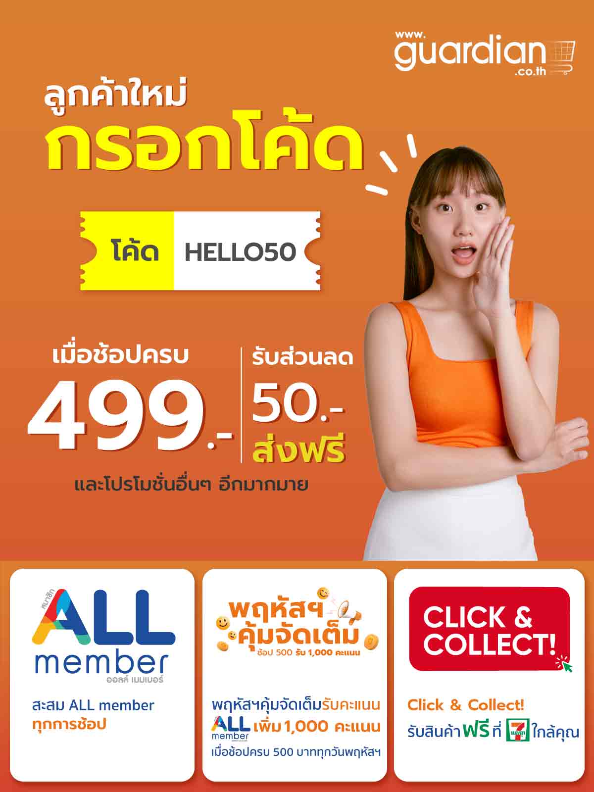 ทุกการช้อปสามารถสะสมคะแนน ALL Member ได้ พร้อมแคมเปญทุกวันพฤหัสบดี จัดเต็ม เพียงมียอดช้อปถึง 500 บาท รับคะแนน ALL Member เพิ่ม 1,000 คะแนน และสะดวกรับสินค้าได้ทุกเวลาที่ร้านเซเว่น อีเลฟเว่น ใกล้บ้าน โดยไม่มีค่าจัดส่ง